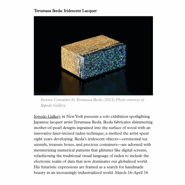 Terumasa Ikeda: Iridescent Lacquer 16 Mar 2023Please join us on Thursday, March 16th, from 5 PM to 8 PM EST. Ippodo Gallery will celebrate the unique creations of Terumasa Ikeda ,...Read more -