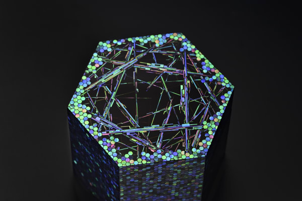Terumasa Ikeda (b. 1987) is an innovative raden specialist; using a laser cutter, Ikeda fabricates shimmering mother-of-pearl Arabic numerals ingrained into the exterior of the lacquered box, creating a holographic luminescence that emanates from within. Ikeda takes a modern approach to his iconography, transforming the lacquer surface into the likeness of a digital screen. As functional objects, Ikeda’s futuristic vessels bridge the worlds of classical and modern lacquer.