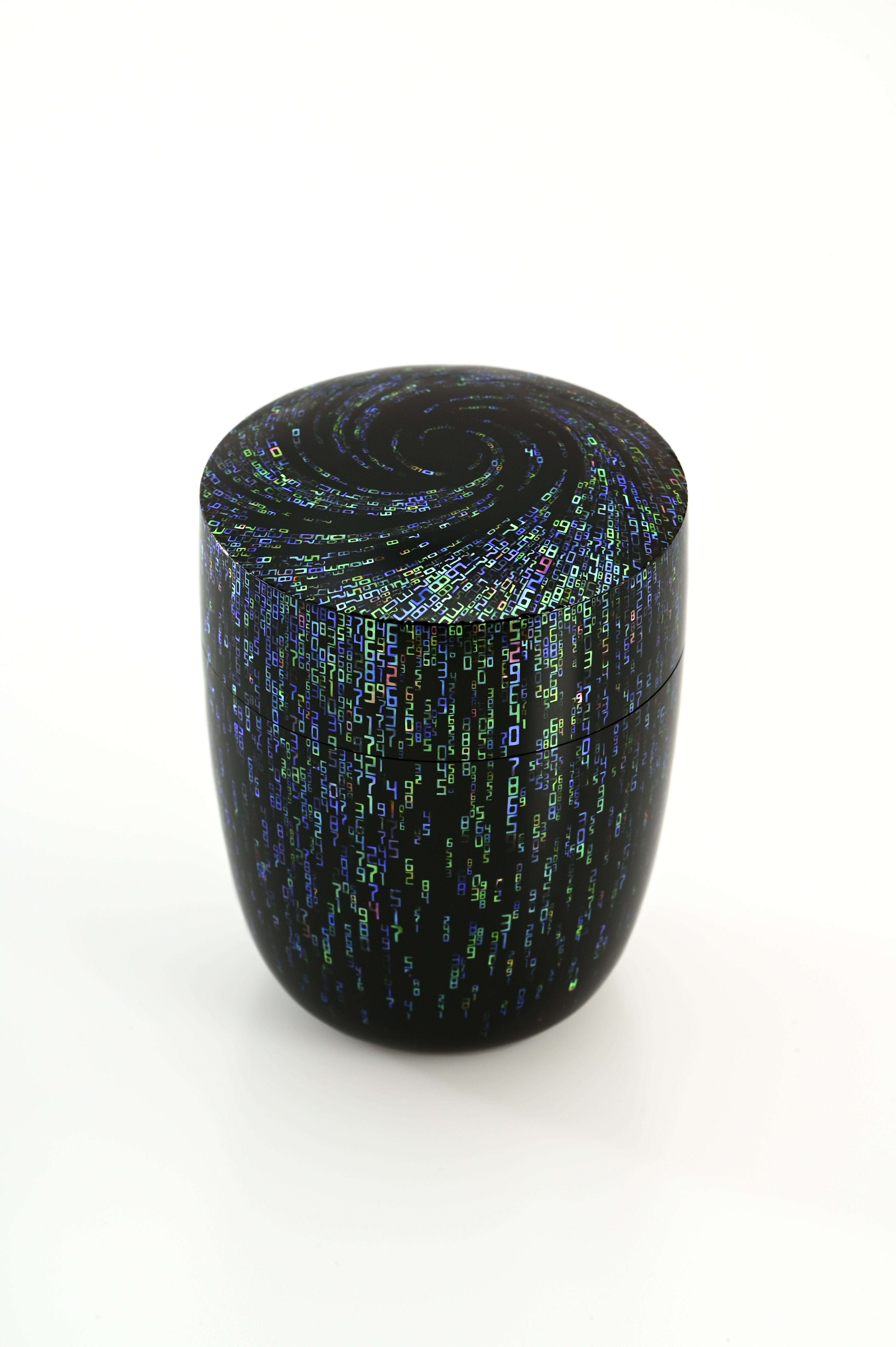 Flawlessly adhered to the lacquer surface, Terumasa Ikeda’s dark tea caddy is illuminated by precisely cut mother-of-pearl. Though raden is a traditional technique, Ikeda manages to present a contemporary innovation inspired by the cyber revolution of the modern age.