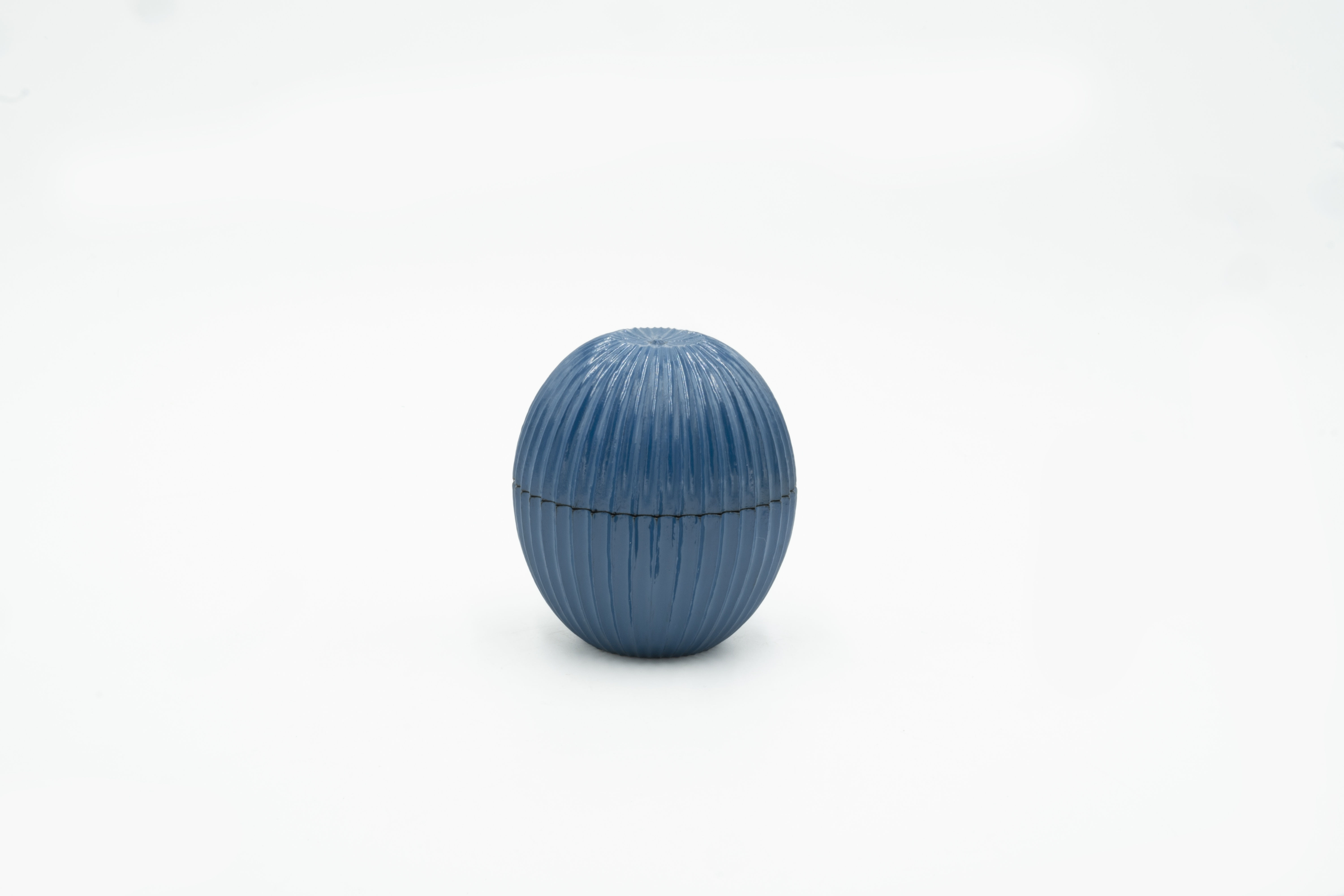 Jihei Murase's expertise and experimentation produced this beautifully vibrant indigio lacquer used to coat the corrugated nakatsugi tea caddy. Each end of the container is equal in size, and a throughline is formed where matcha is kept. The brilliant blue is a pigmentation created using a formula known only to Murase.