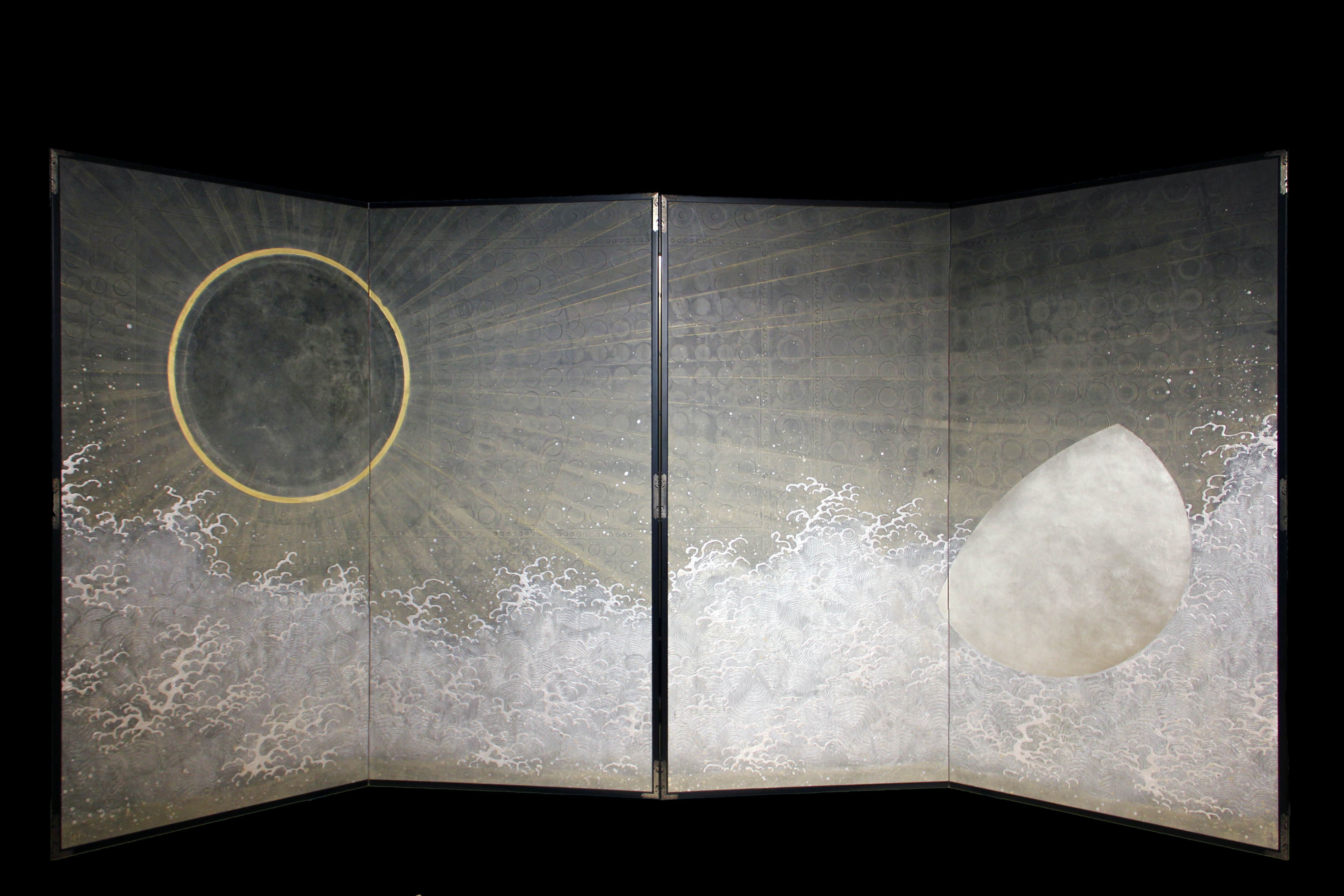 In reference to the great Shingon Buddhist monk Kūkai, who famously retreated to a seaside cave to view the daily cycle of sun and moon, Ken Matsubara's multi-media folding screen is a dance between the celestial bodies as they emerge and vanish into the ocean. Sculpted with clay-resin paint and mica resin, the crashing waves are simultaneously flowing and frozen in time. Constituted of a pair of screens, Matsubara achieves iridescence throughout the image owing to an underlayer of red iron-oxide called bengara.