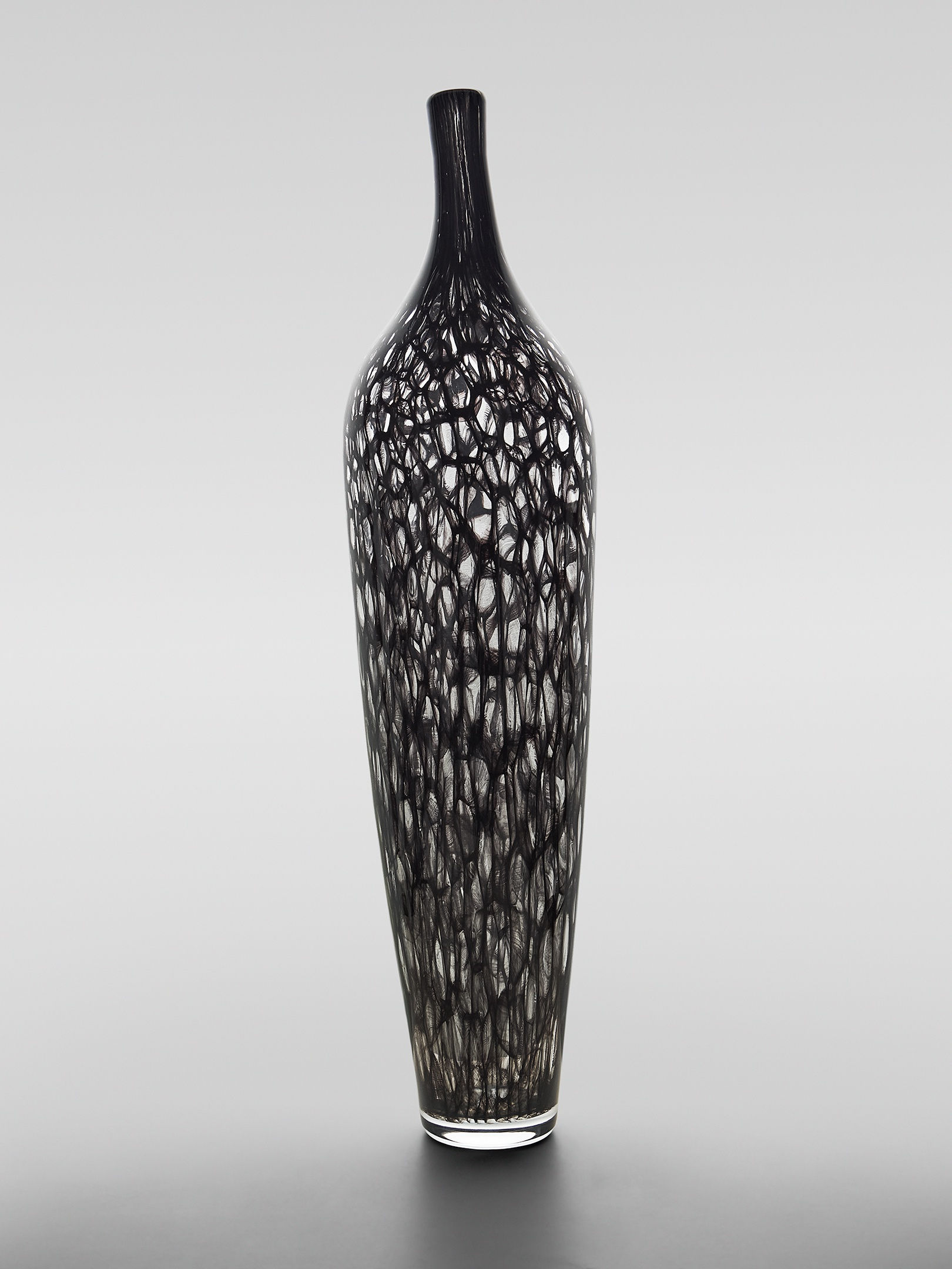 Made using the traditional Venetian reticello glass technique, Kodai Ujiie crafted a unique form by tilting the neck and shoulders, dense with patterns resembling heavy rainfall. The form of this inanimate work emulates a black crane curiously examining the unexpected viewer who has stumbled into its territory.