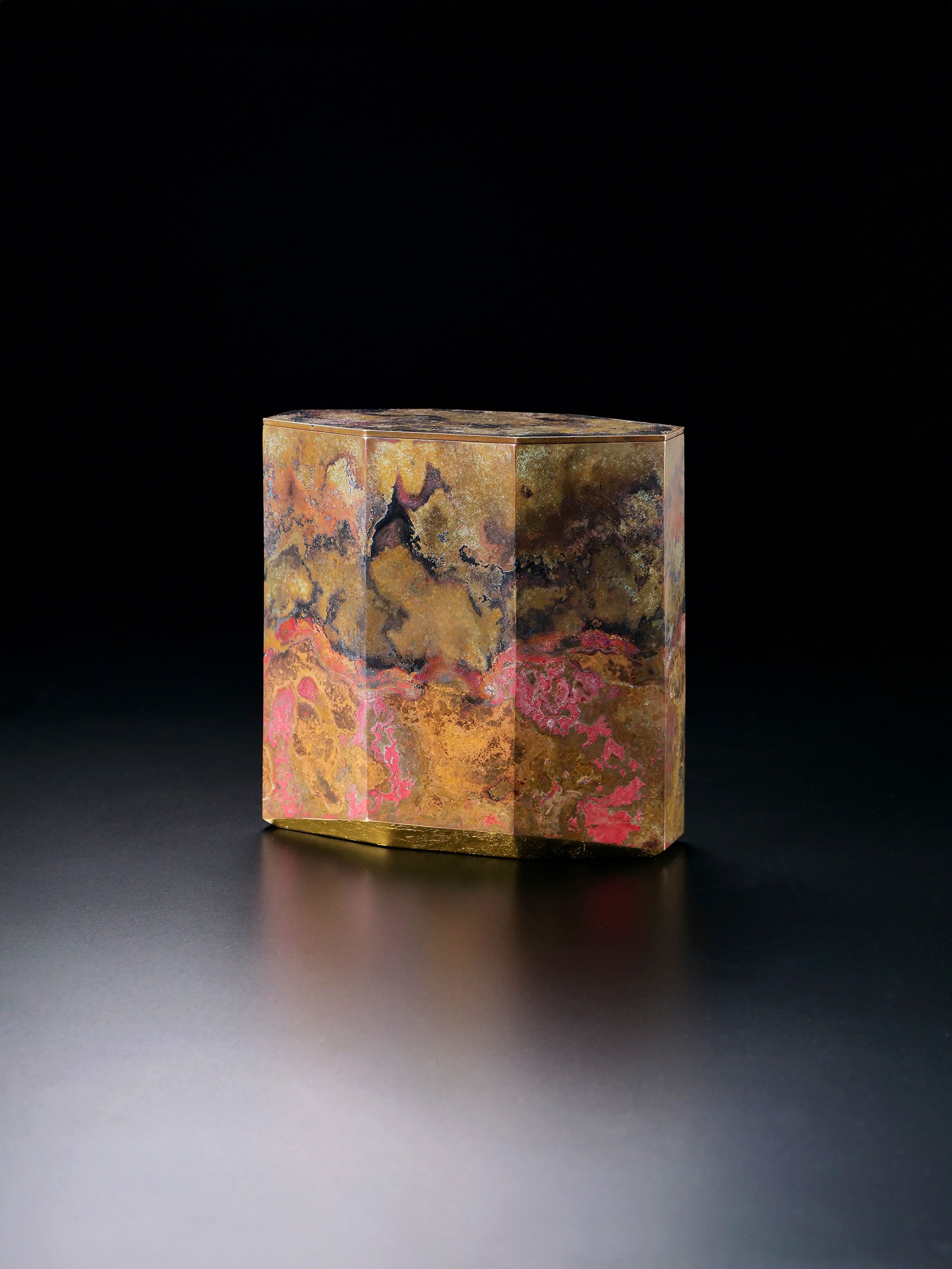 A professor at one of Japan’s top intuitions, Tokyo University of the Arts, Hirotomi Maeda’s works are so highly sought after that the artist was invited to produce a piece that was presented to Emperor Naruhito on the date of accession in 2019. Constructed for the highest of occasions, Illustrious Reflection is forged from precious gold, silver, and copper. Using an alloy of the three metals, Maeda forms the shape and patterning of the vessel by hand.