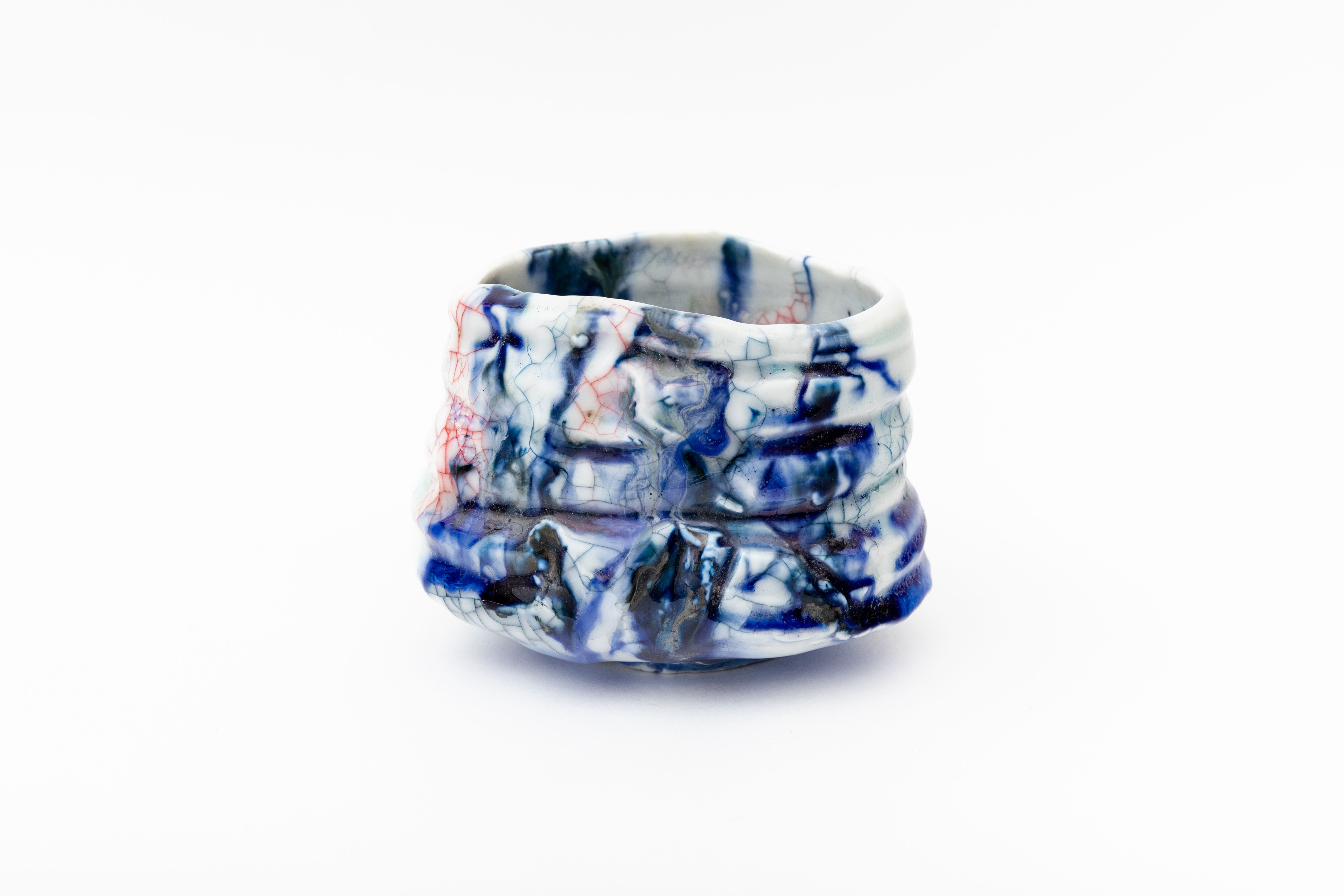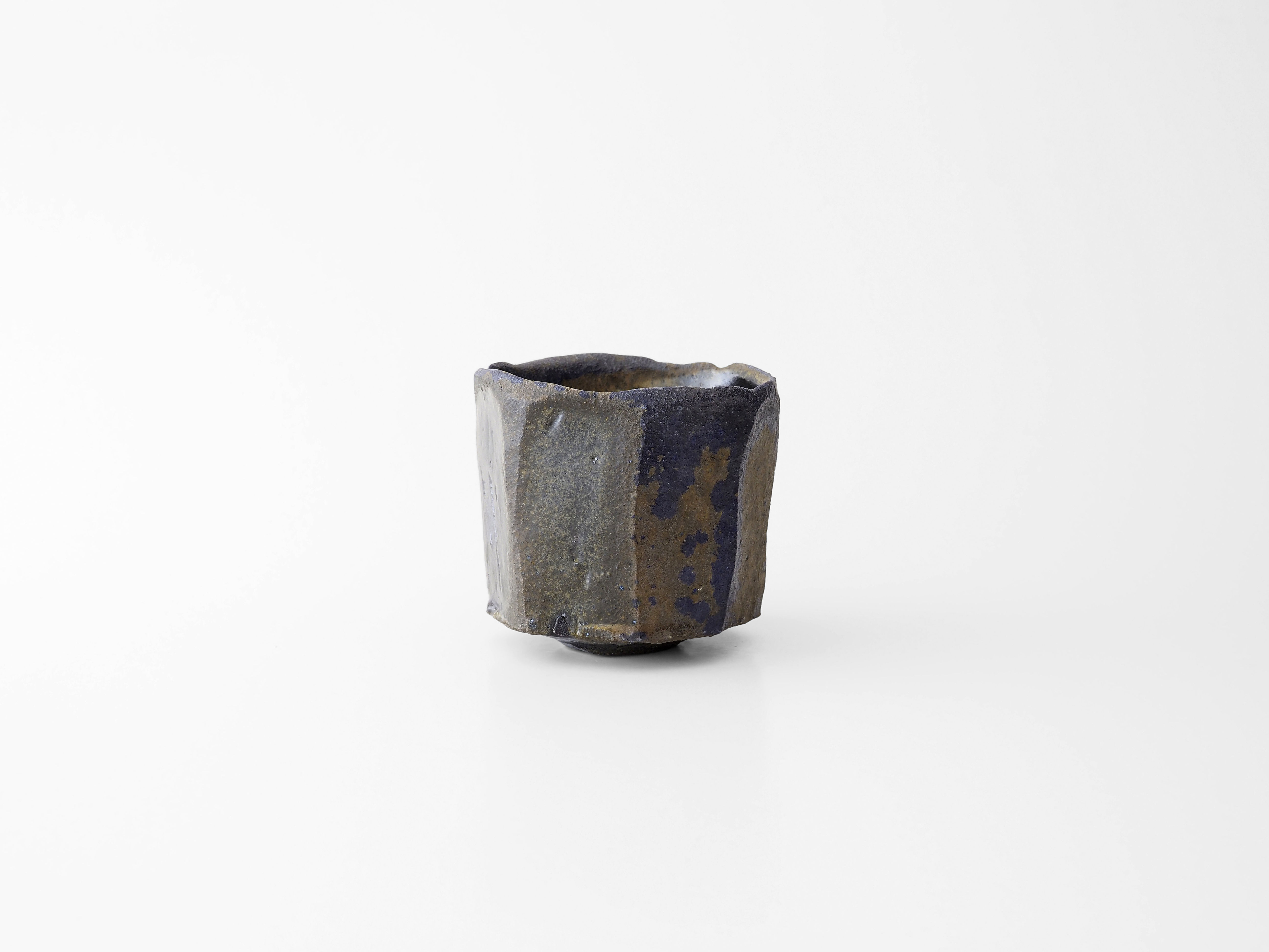 Relatively equal in height and width, the shaved tea bowl appears polygonal from eye level. The brown and blue hues of Hiroshi Goseki's unglazed yohen tea bowl resemble undulating hills in nature, complementing and harmonious with the artwork's overall earthen aesthetic. Dropping suddenly to the foot, the bowl gives the illusion of floating in the air.