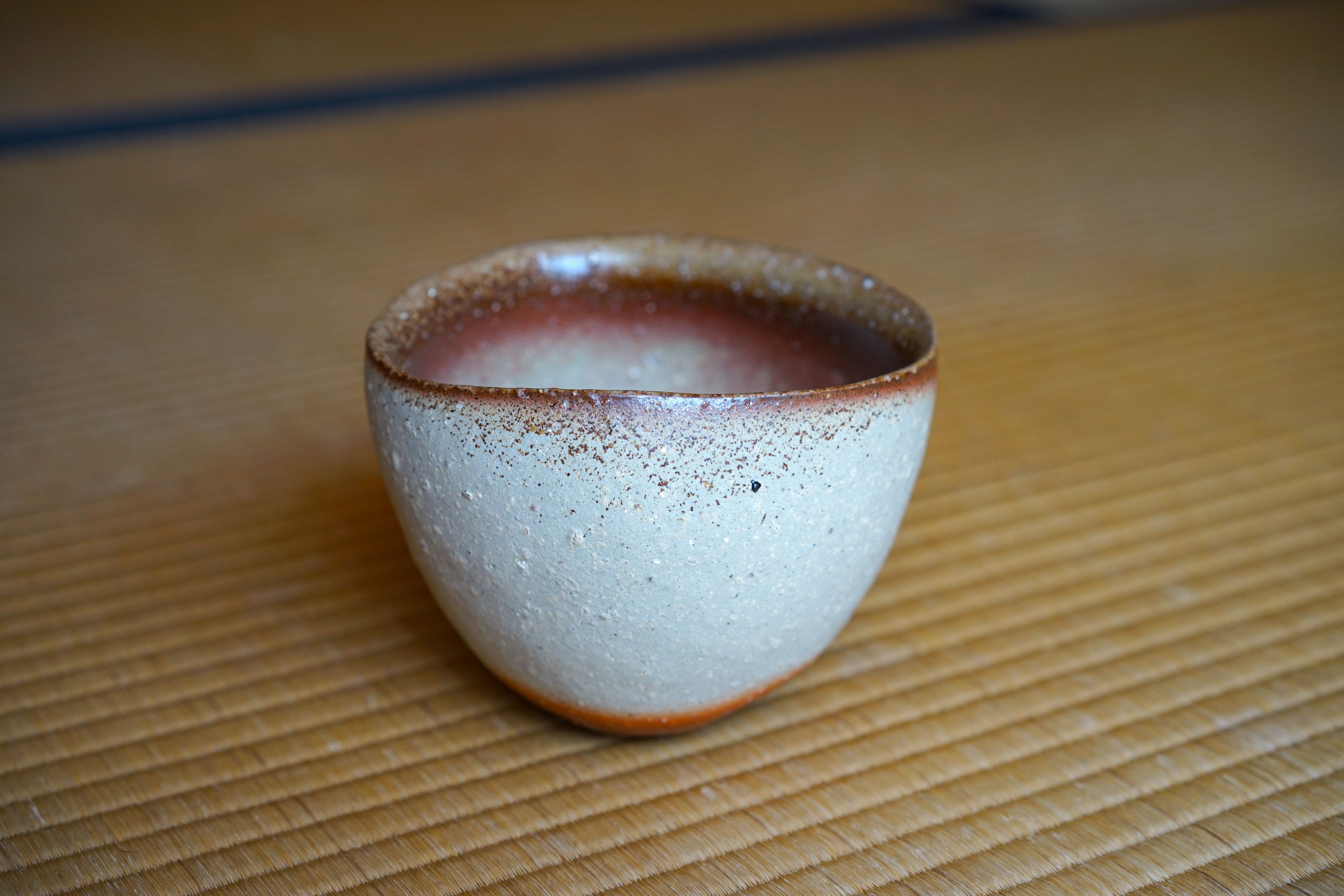Koichiro Isezaki's bold ceramic tea bowl is tinged with red and brown. Isezaki practices the hidasuki technique, which involves inserting rice husks into the kiln. Through this process, the colors form organically without any glaze.