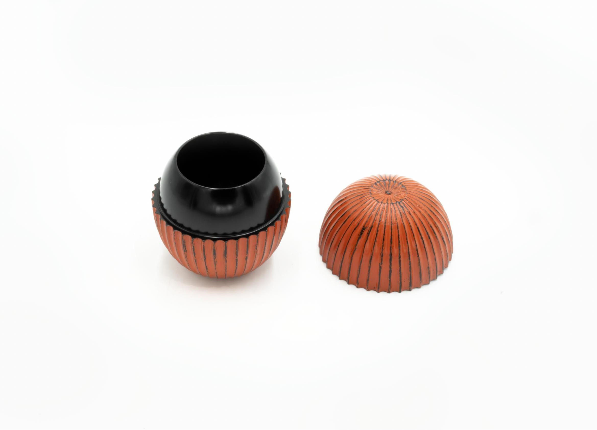 The animated vermillion of Jihei Murase’s flawlessly carved tea caddy, engraved with the symbol of the chrysanthemum, is one of the iconic markers of negoro style lacquers. Vivid as a flame, Murase’s caddy creates an atmosphere of warmth and tranquility. Prized in Japan as the color of prosperity, red is also a ward against evil and a way to ensure a season of happiness and luck.
