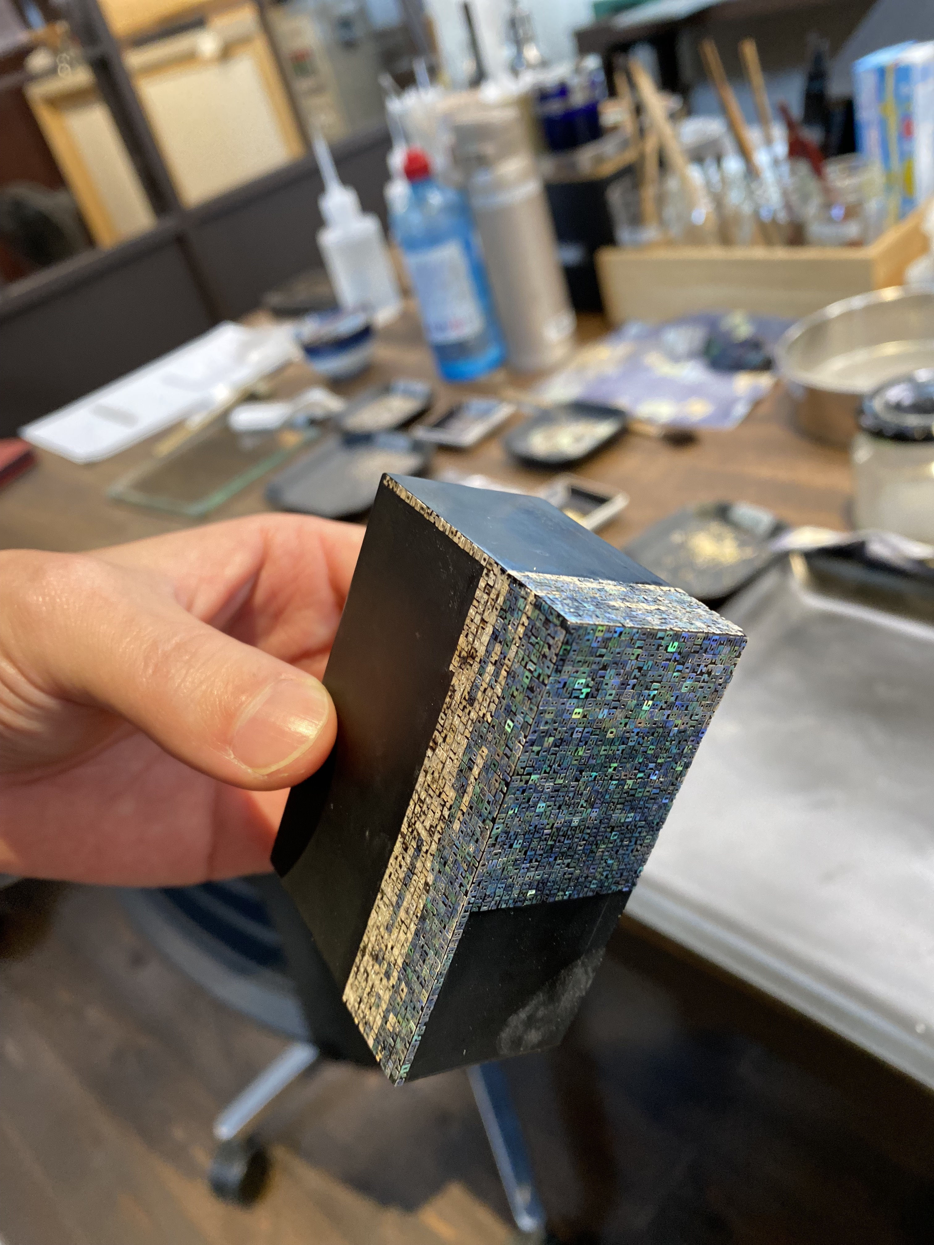 Ikeda coats the almost finished artwork with titanium and palm oil and applies charcoal to the surface, gradually shaving away the excess pearl down to 0.05mm. The final surface is a single glossy plane, impossibly thin pearl integrated perfectly with the flat lacquer façade.