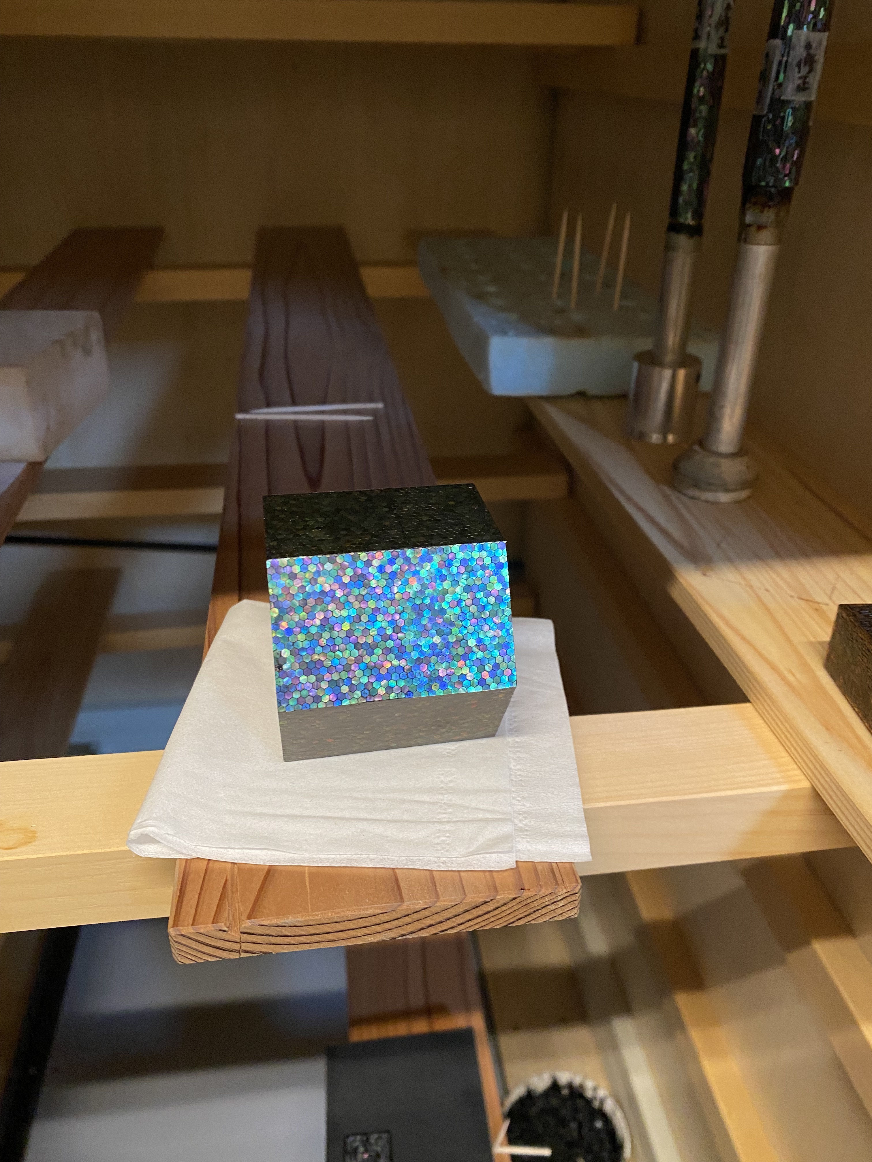Once the lacquer film has been applied, there is only a short window to place the decorations before the bonds have set. A highly concentrated process, each hand focuses intensely to inlay the mother-of-pearl for hours at a time. The lacquer must then rest, housed within a specialty temperature-humidity control storage to dry. Piece by piece, the ornamentation envelops the object, until the entire work is clad in a jewel-like sheath.