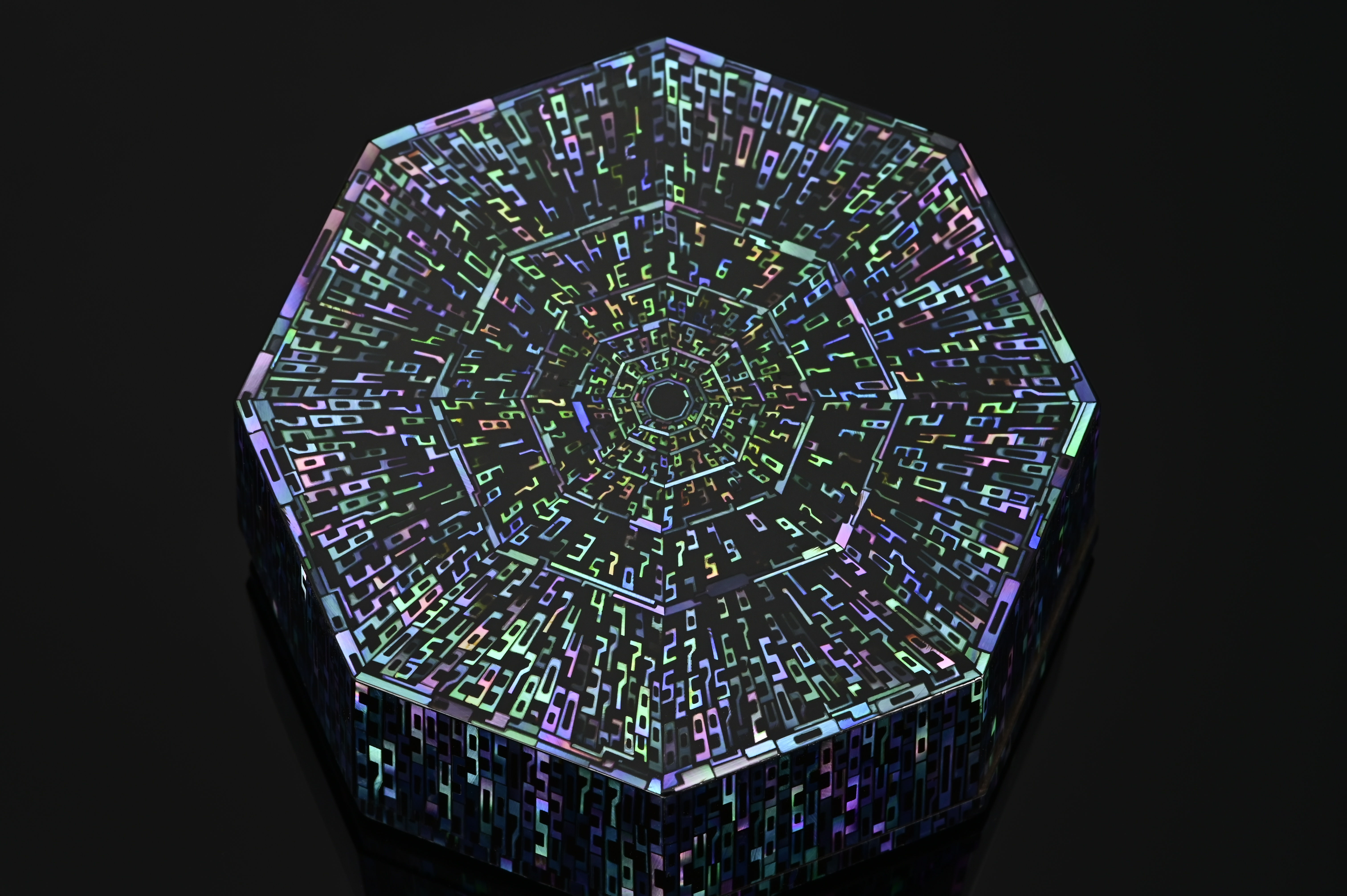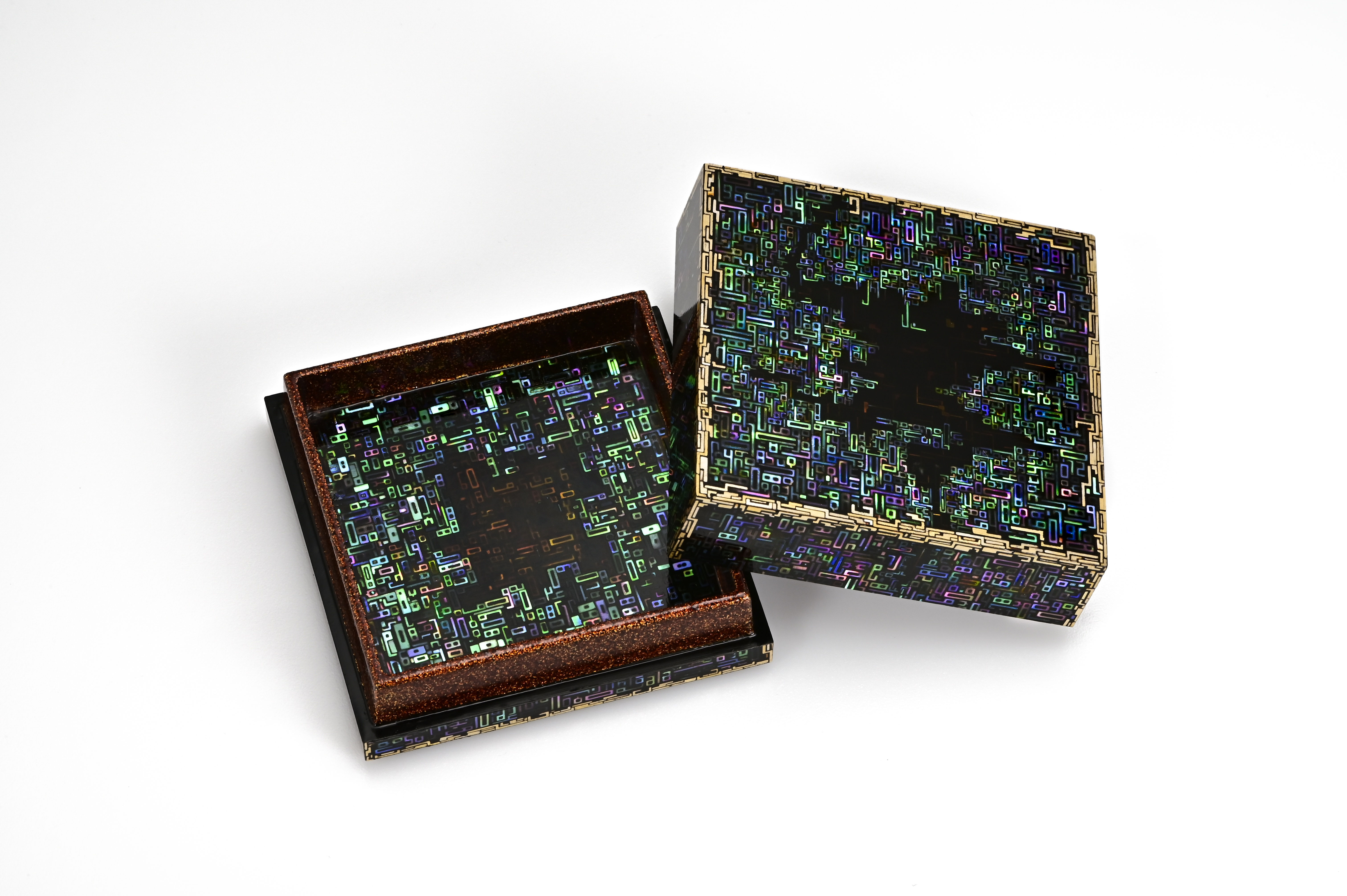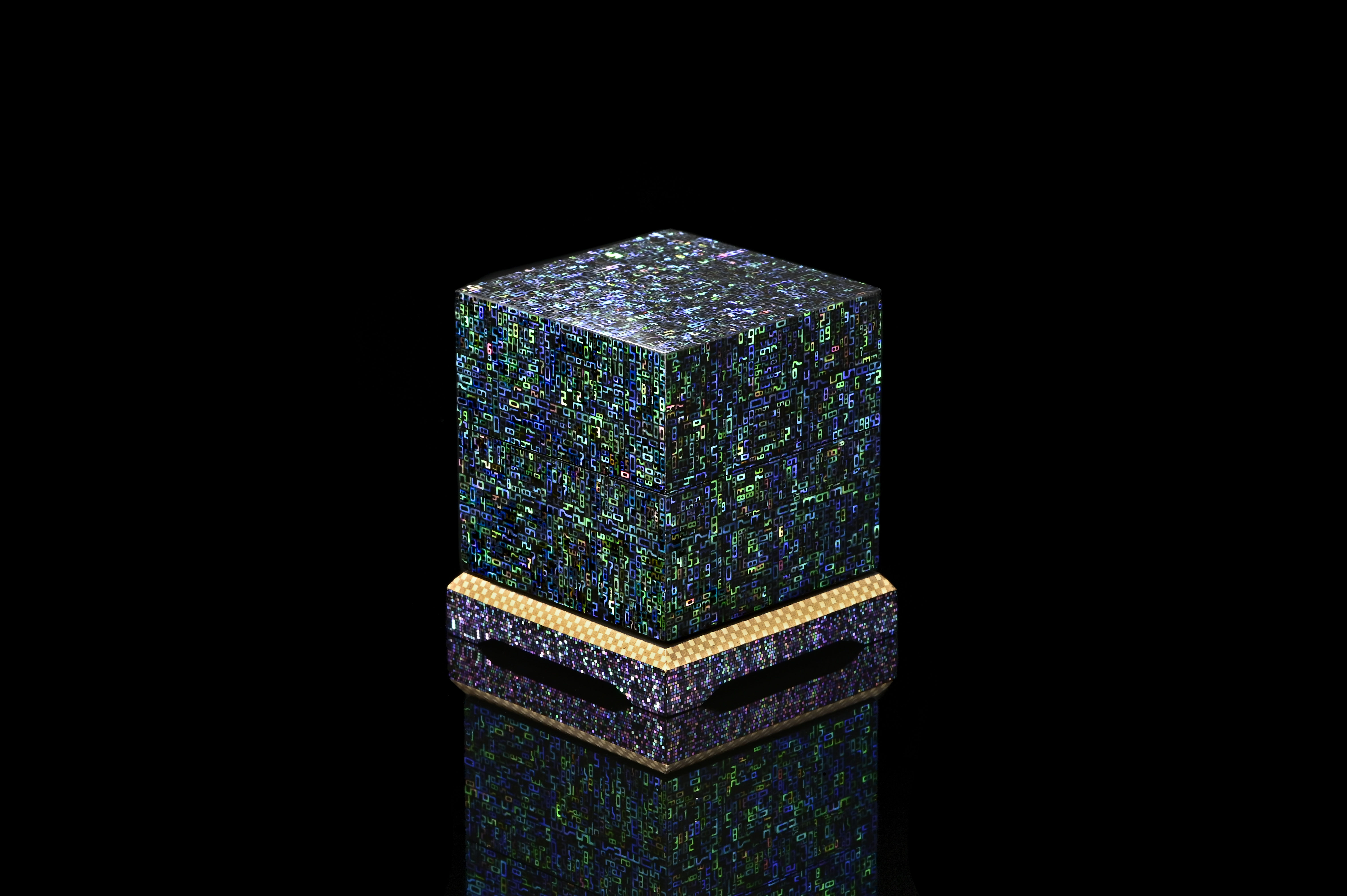 Terumasa Ikeda’s debut exhibition in the United States features the artist’s impressive and imaginative renditions of kogo, the Japanese incense container. An item primarily used in tea ceremony, the incense container is not for the purpose of burning the fragrant chips, but rather their transport into the chashitsu (tea house). Inside, the container resets within the tokonoma (alcove) where its presence has a strong influence on the surrounding atmosphere. Decorously opened in front of the guests, the incense container, unlike tea caddies, are decorated both inside and out for maximum effect. Ikeda’s collection of kogo impresses to a dazzling degree. Inlaid with four species of mother-of-pearl in mesmerizing and undeniably contemporary patterns—such as the likeness of the Hadron Collider made from numerals—these raden artworks are expressions of the technological sensibility that permeates modern society.
