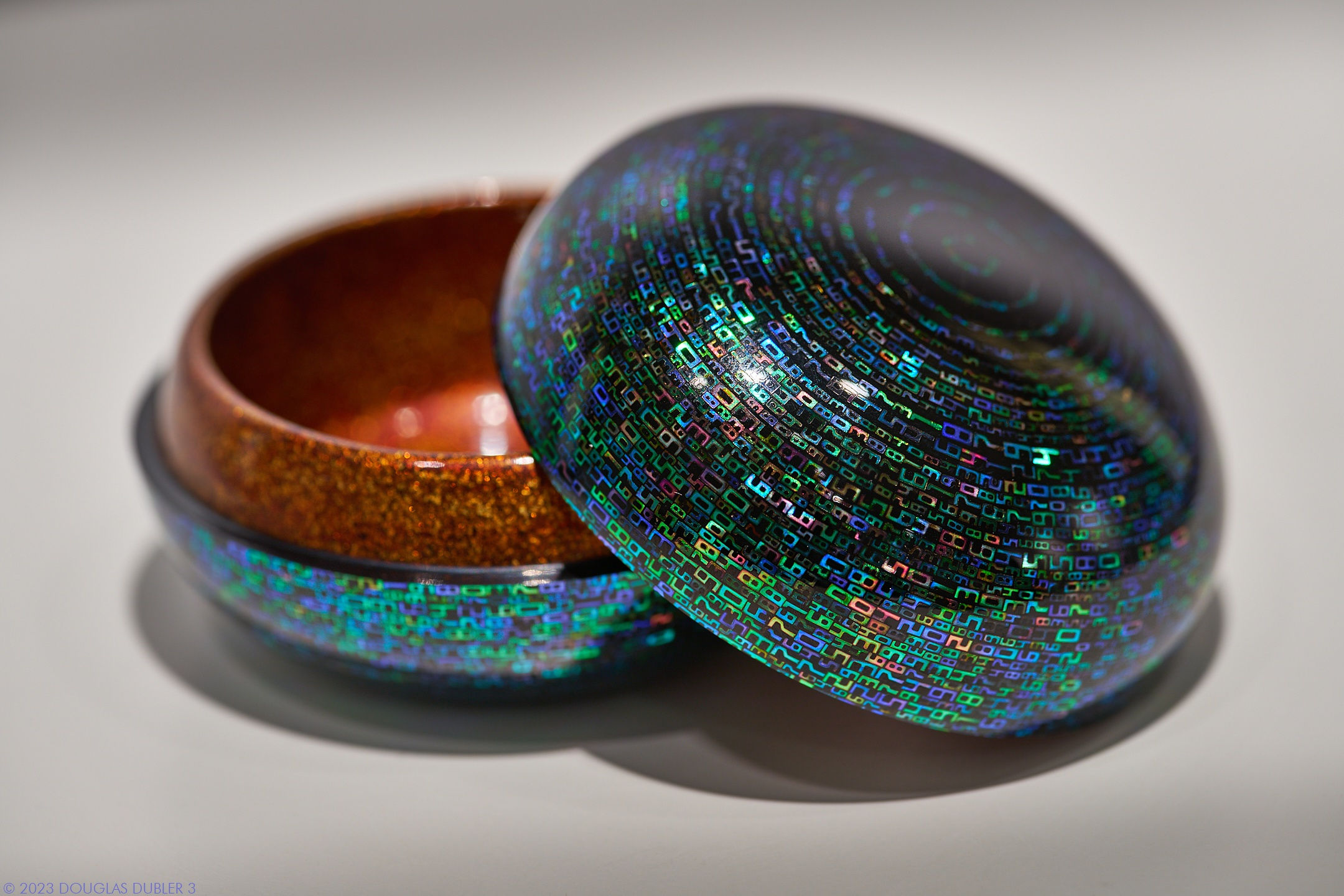 Ikeda’s Iris, which emulates the human eye, is a rounded body constructed from two even halves of cypress wood. Clad in urushi lacquer and adorned with laser-cut mother-of-pearl, the container exemplifies Ikeda’s unique approach to a form which has been present in Japan for more than a millennium. The interior is decorated in the maki-e style: gold powder is adhered to the surface with clear lacquer in a fusion of the traditional Kanazawa technique and Ikeda's innovative methods. The final appearance is called nashiji—fuzzy pear skin.