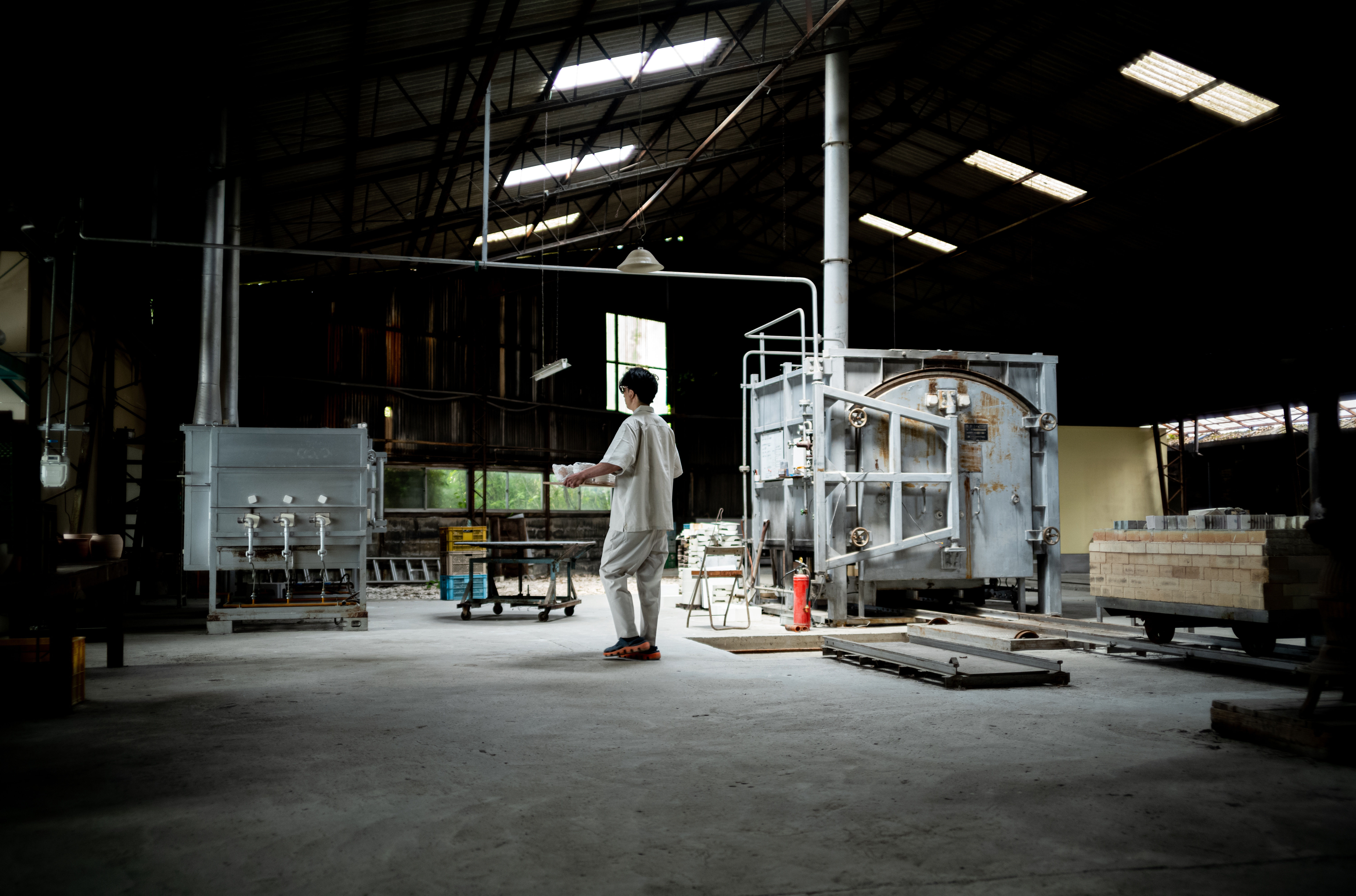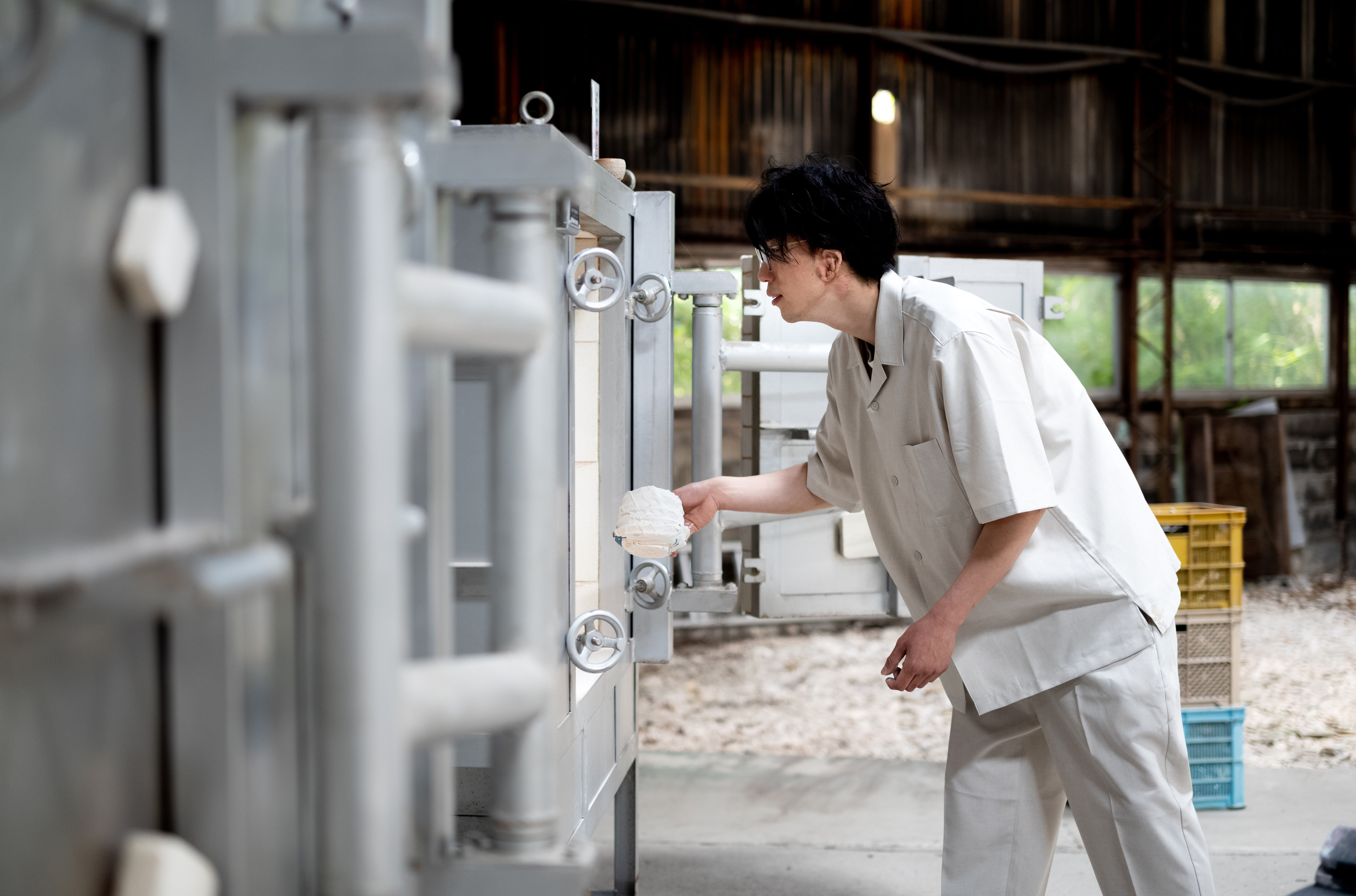 Kodai Ujiie bisque-firing ceramic in his Shibata-gun, Miyagi Prefecture studio.