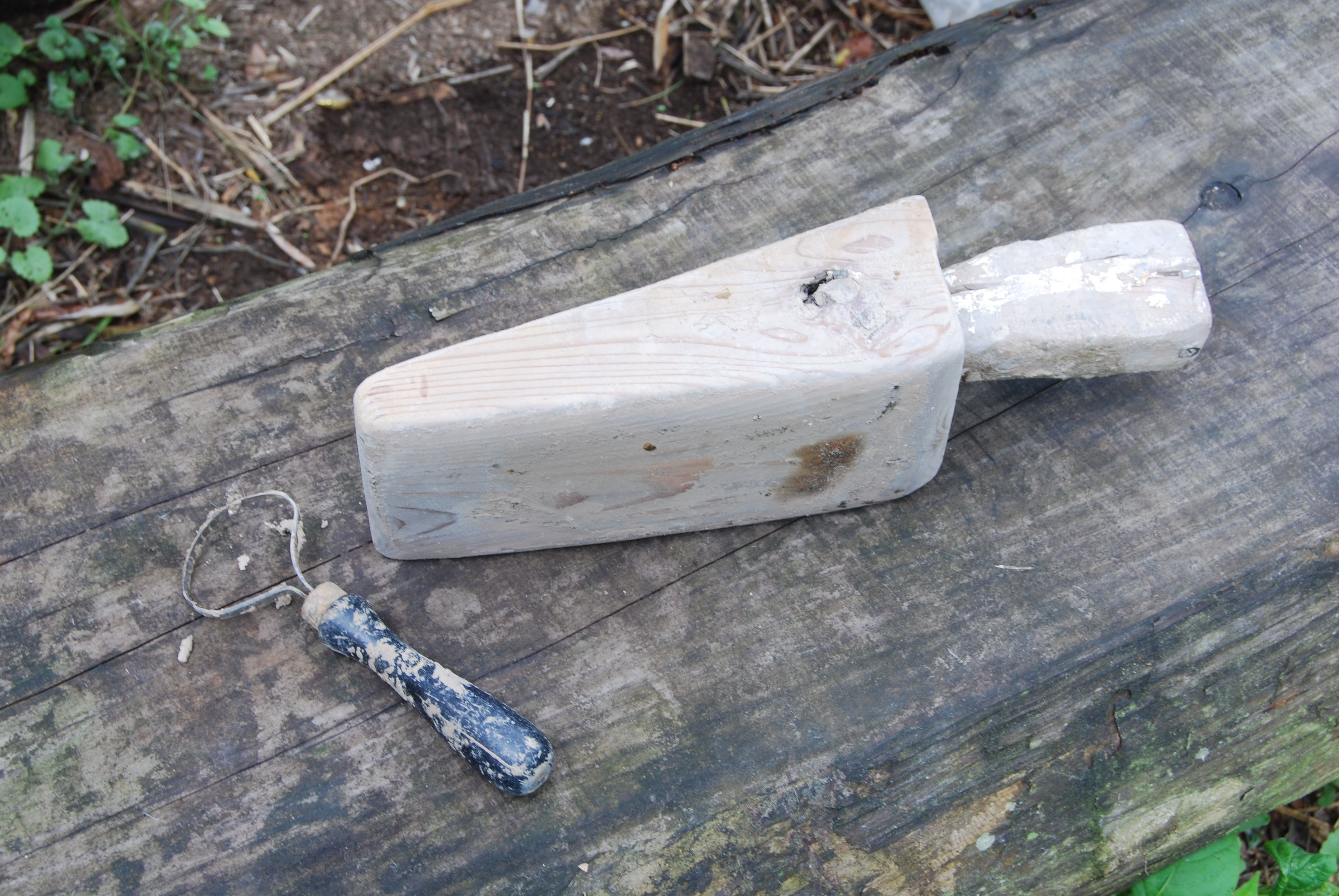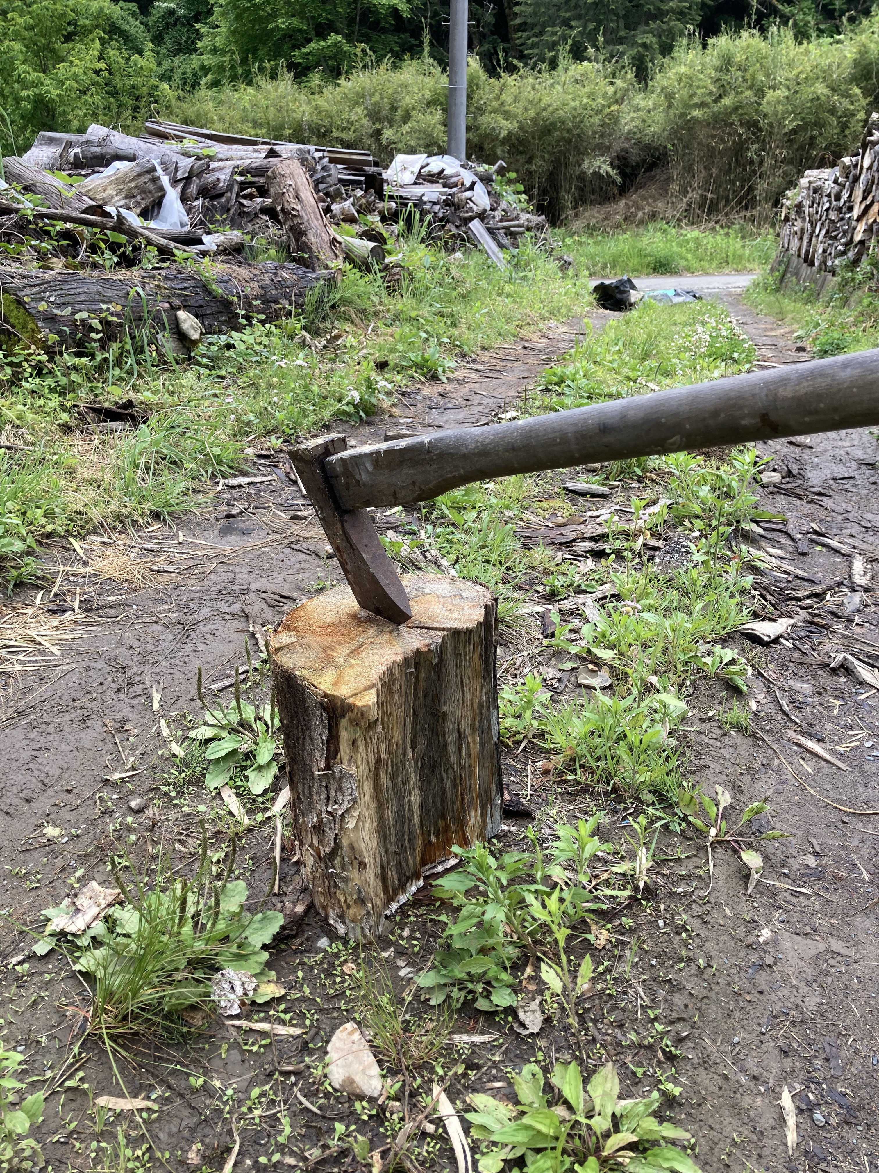 Wood chopping block for kiln fuel.