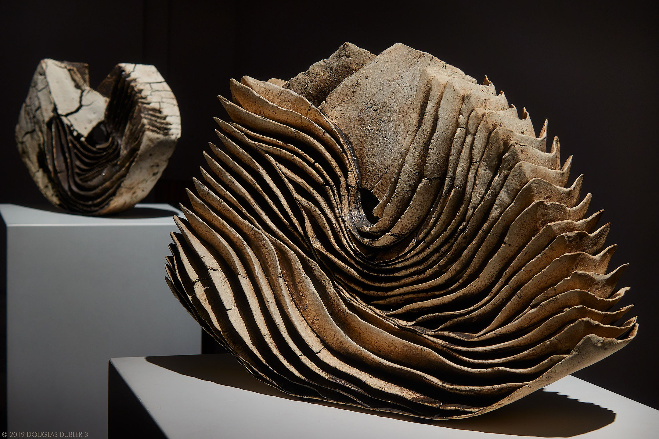 Yukiya Izumita evokes the harsh and powerful seaside environment of northeast Iwate by layering laminated ceramic waves. Working with local iron-enriched clay and driftwood brought in by the tides, Izumita’s ceramics appear brittle and coarse yet are warm to the touch.