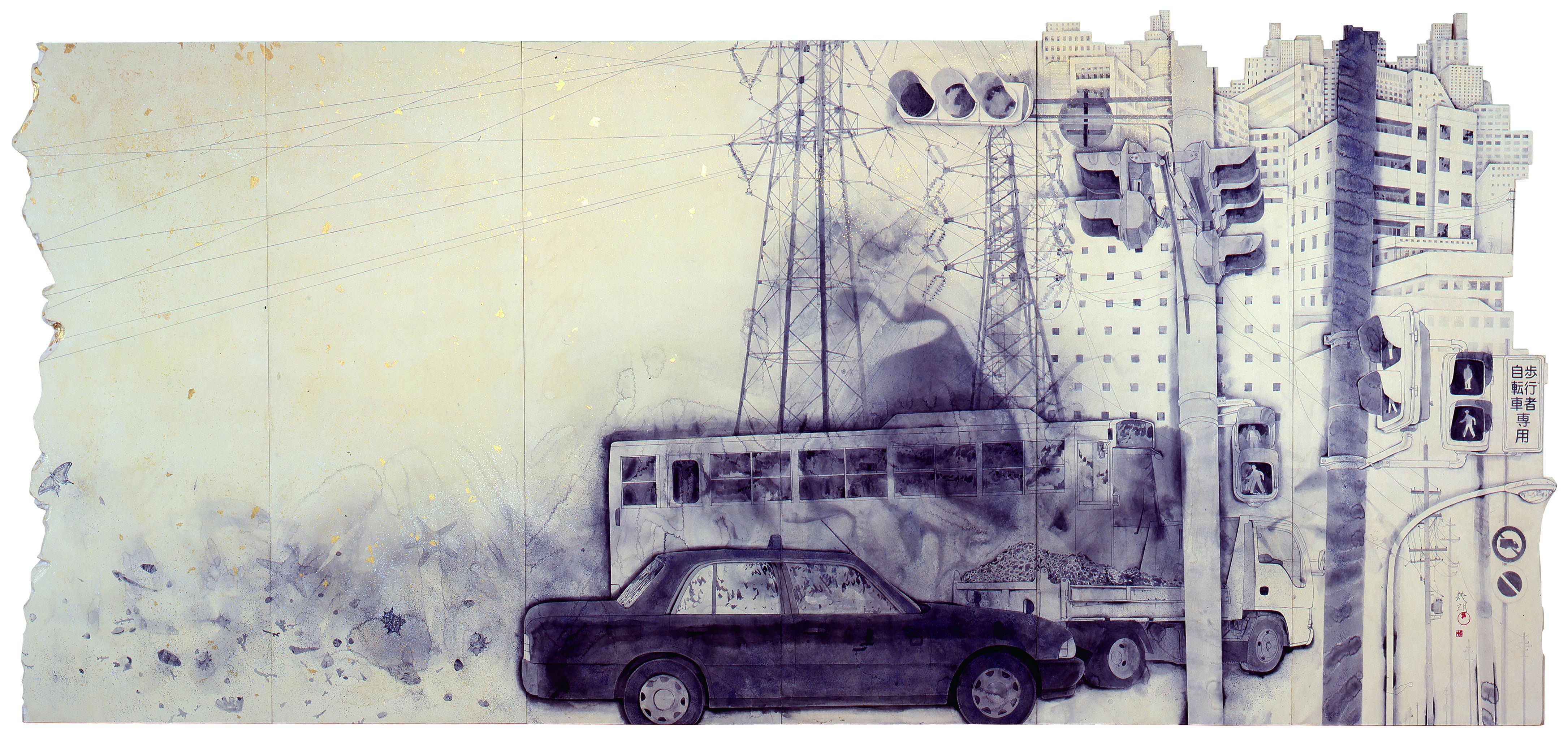 Recycling is an expression that Japanese people have valued for a long time, and they have been using it in different ways, for example, by patching parts of clothes or using old house posts for different purposes. My collage is also a new expression of what used to be a way of restoring shoji screens by pasting different paper over them when the paper was torn.