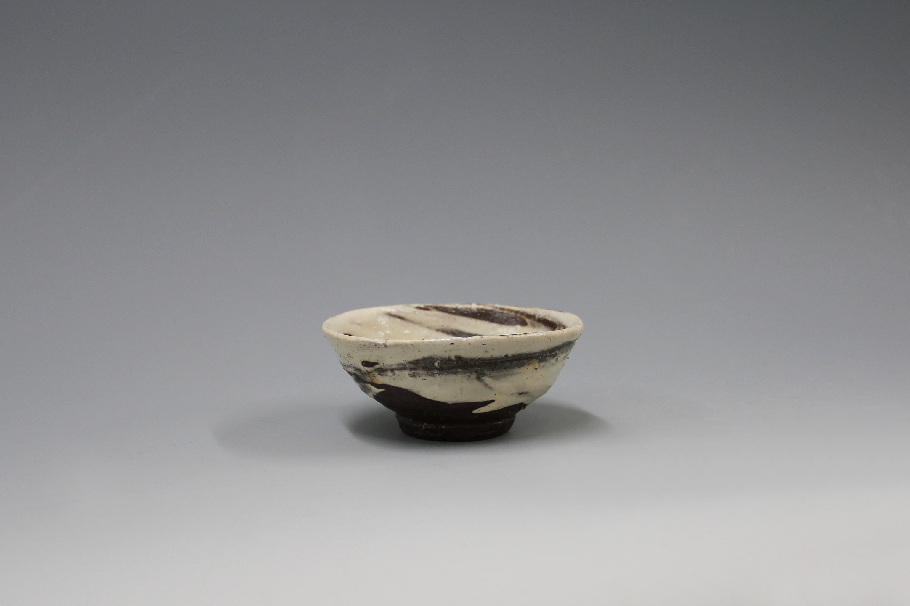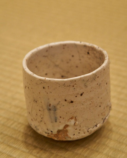 The traditionally cylindrical form of Shiro Tsujimura's tea bowl, glazed with a generously thick layer of white shino glaze, feels like applying a brushstroke of paint onto a freshly primed canvas.