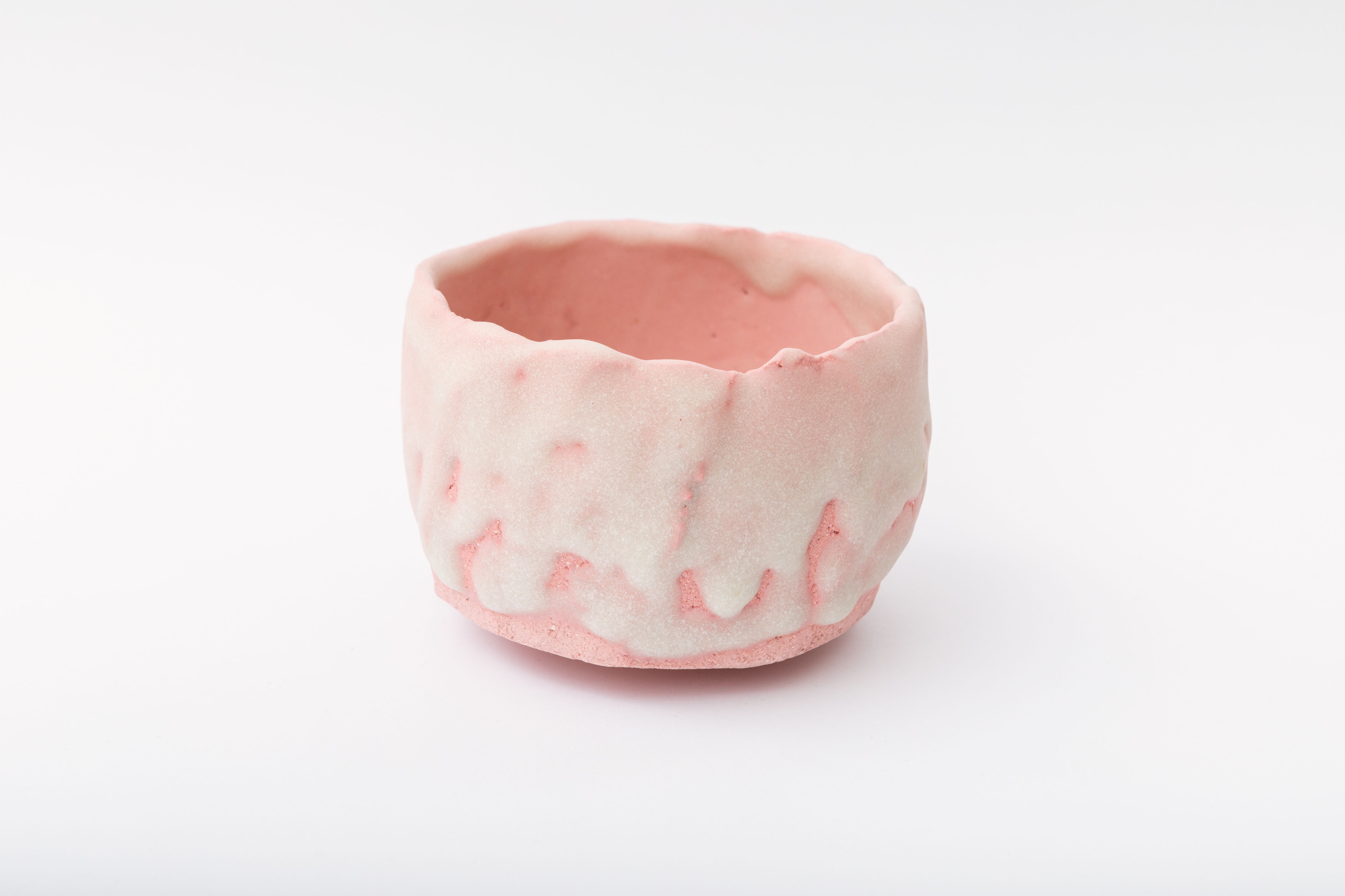Hoshino uses thick glaze application to create this luxurious, frosting-like tea bowl. The form of the bowl, unassuming and stout, does not register as ceramic. The delightful colors of baby pink under creamy white make us imagine the piece as more than an object, more than a solid, something that transcends matter that could melt to our palm, flow through our fingers and remain in its current form.
