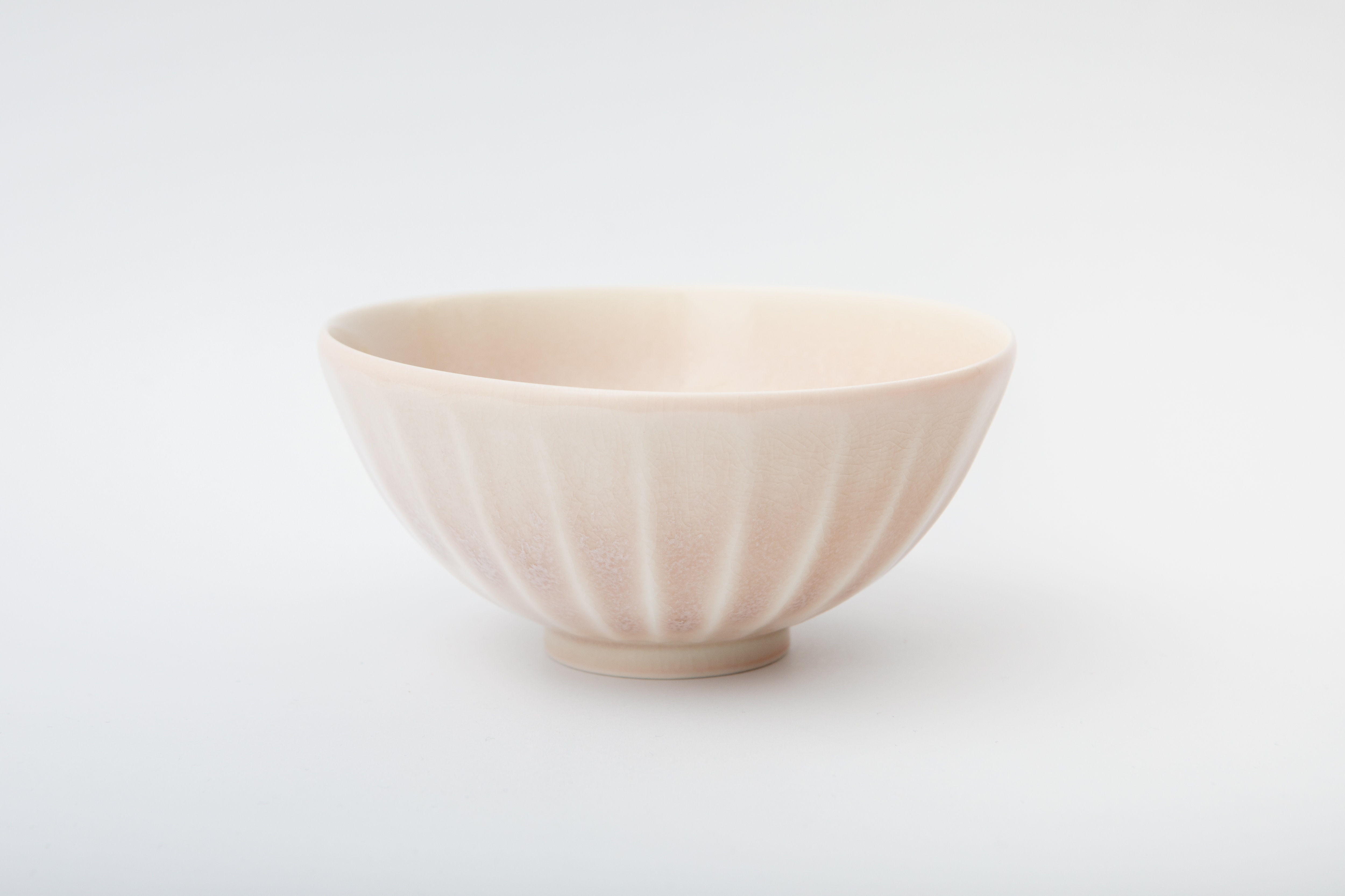 This Benihari Tea Bowl by Hoshino uses mishima to create soft, revealing surface textures. The pink stoneware of the piece is coated with an opaque, off-white overglaze, shiny throughout the form. Then, the glaze is wiped away and the true textured surface is revealed. The glaze acts like a blanket of mist, washing over the ridges of the peak of a mountain.