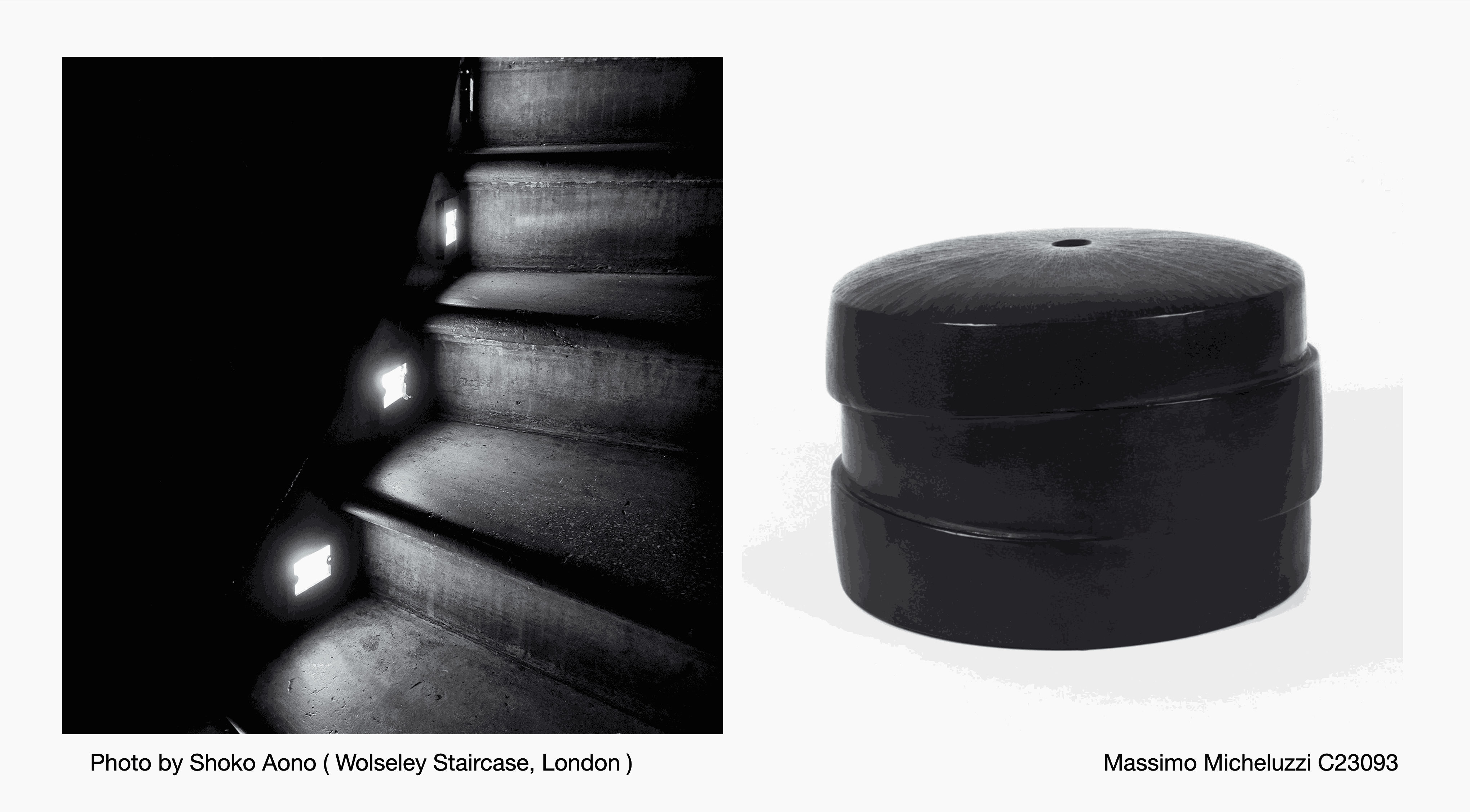 Micheluzzi's white piece with black cracks all over reminds me of a desert or the vast roads of trade that have been spread across the world. Here we see this piece juxtaposed with Shoko Aono's image of broken ice on a cold winter day.