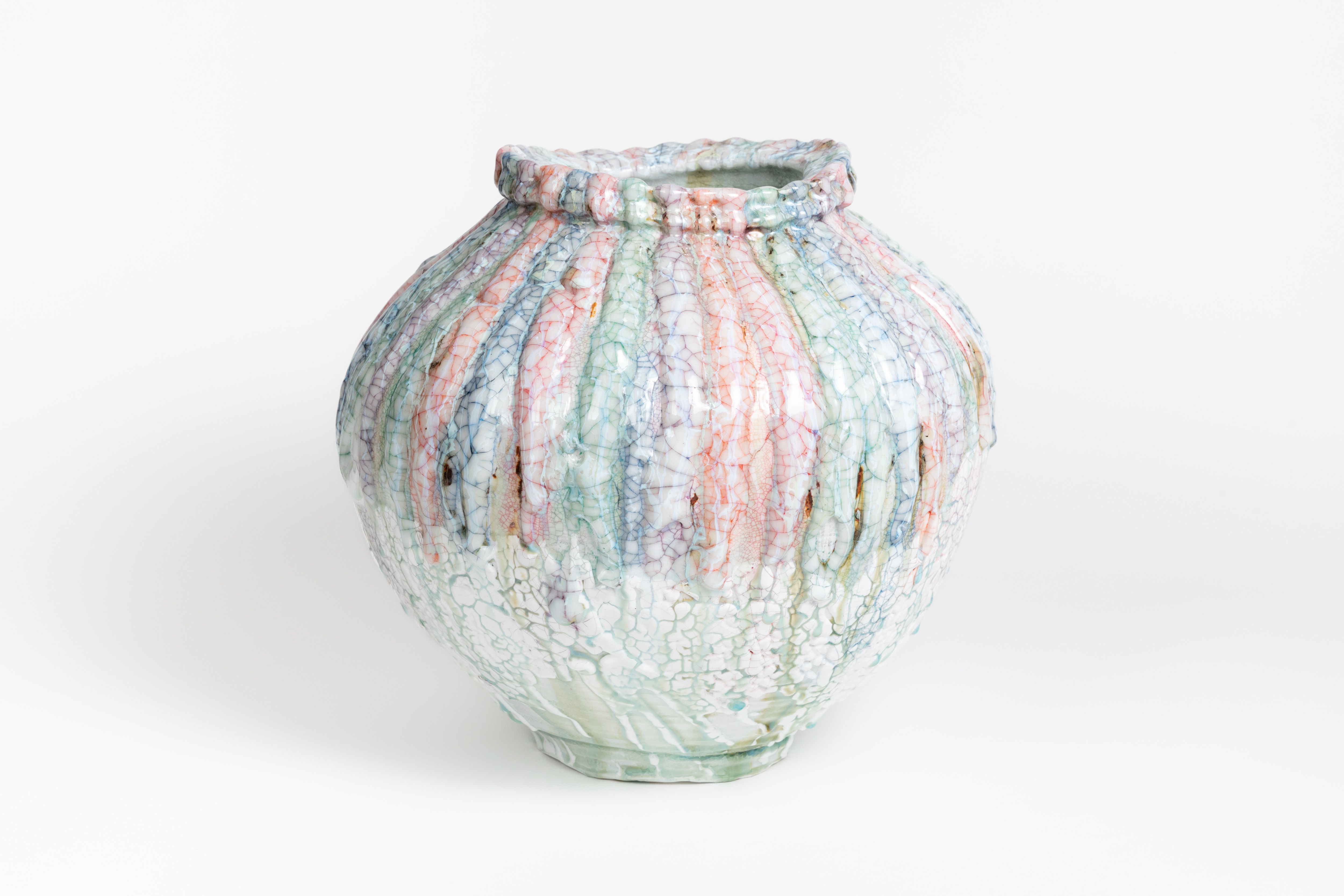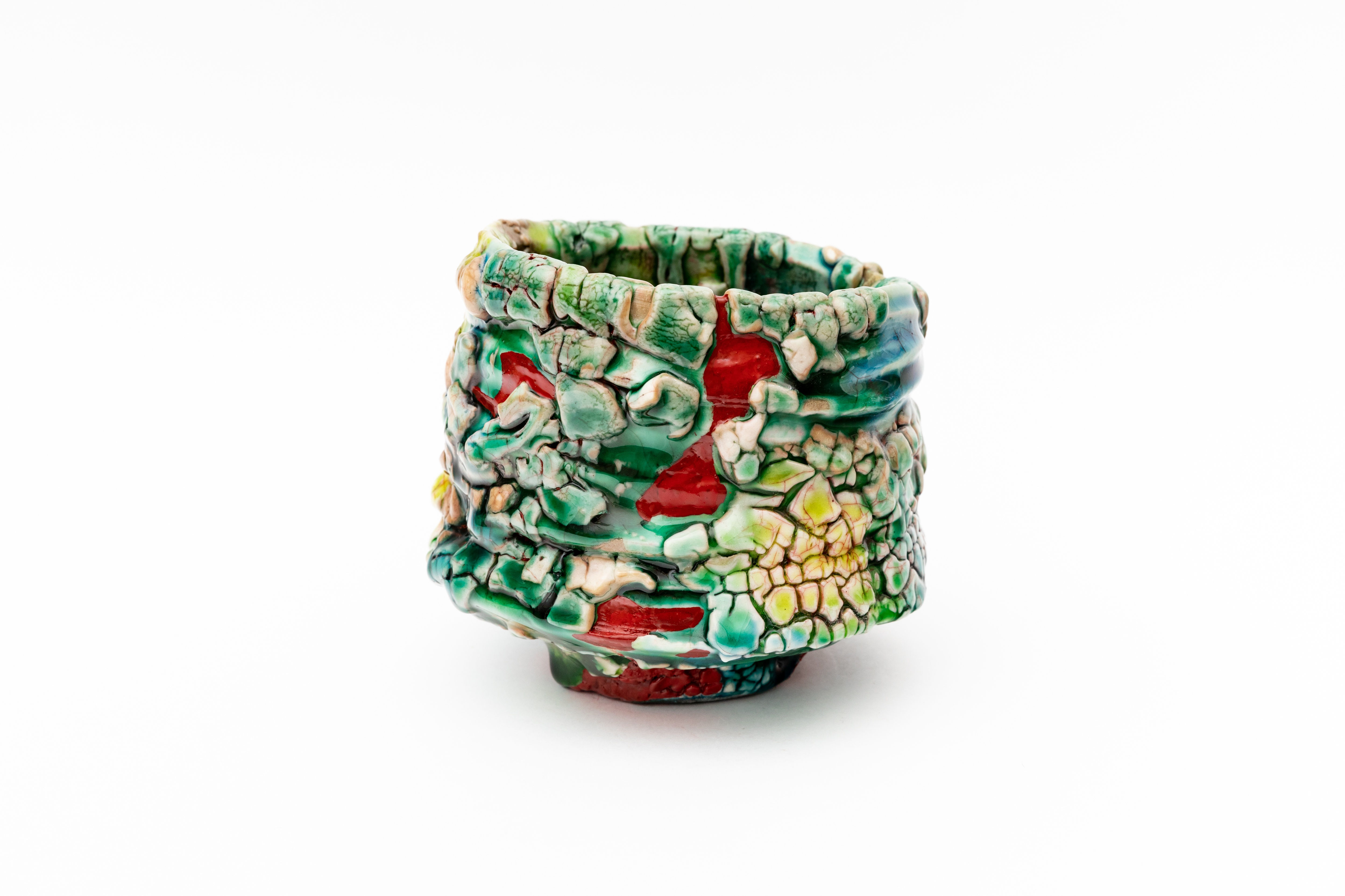 The organic and grotesque lines and forms created, inspired by human layers of skin and flesh, are ever-present—rows of dripping red, green, blue, and purple lacquer drip down the bumpy surface. Combining Ujiie's unique kintsugi style and texture, warted like a gourd is an eye-catching work of art.