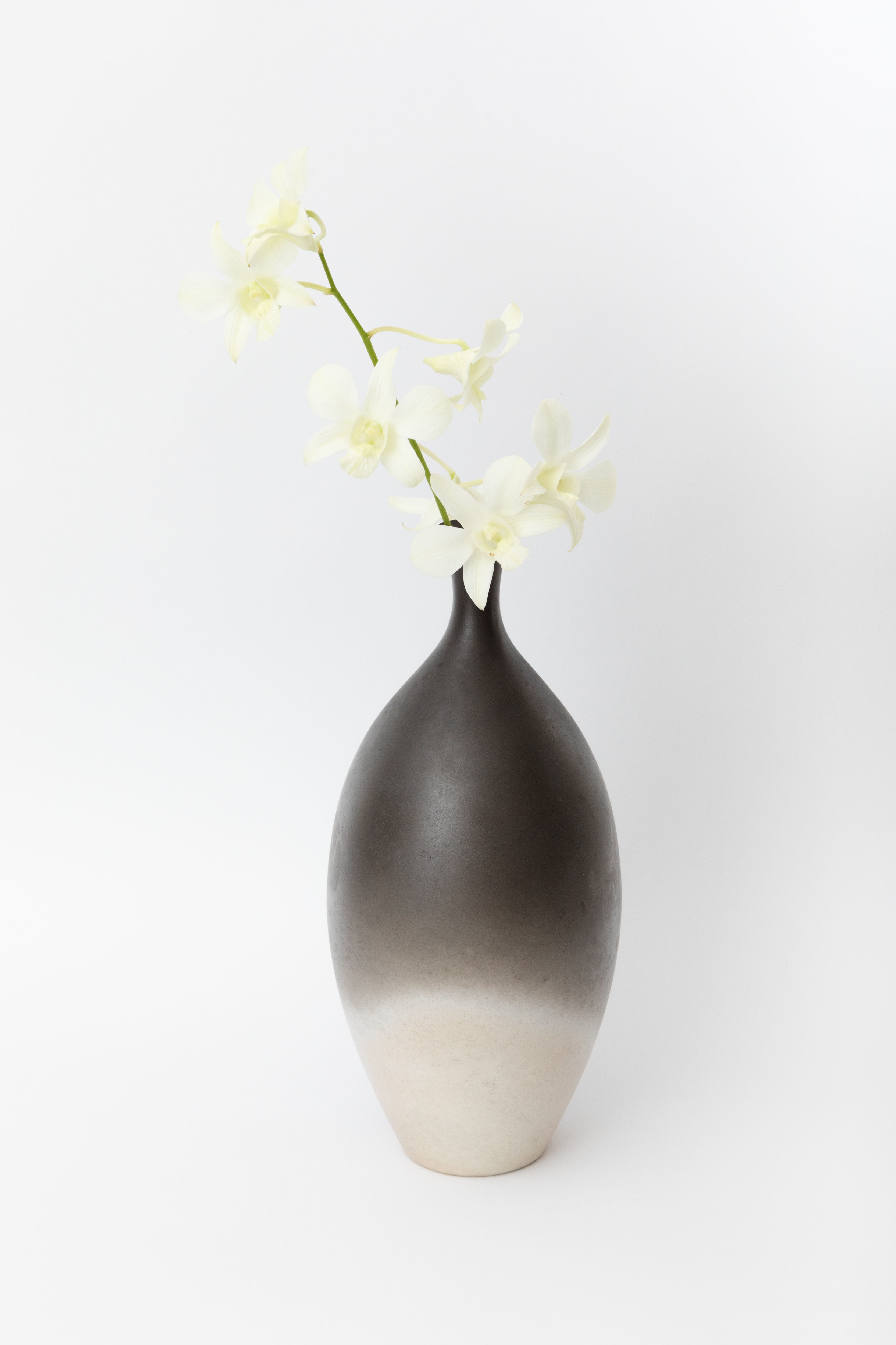 In some of Morioka’s pieces, she expertly directs a viewer’s attention to the natural splendor of the vase by constricting the mouthpieces so that only a single flower or two may display at one time. The restriction imposed by these formal choices invite viewers to dive deeper into the subtly variable grey tones. For the artist, the gentle texture of the porcelain surface combines with the vast depth of neutral color to produce a wistful Kanazawa sky.