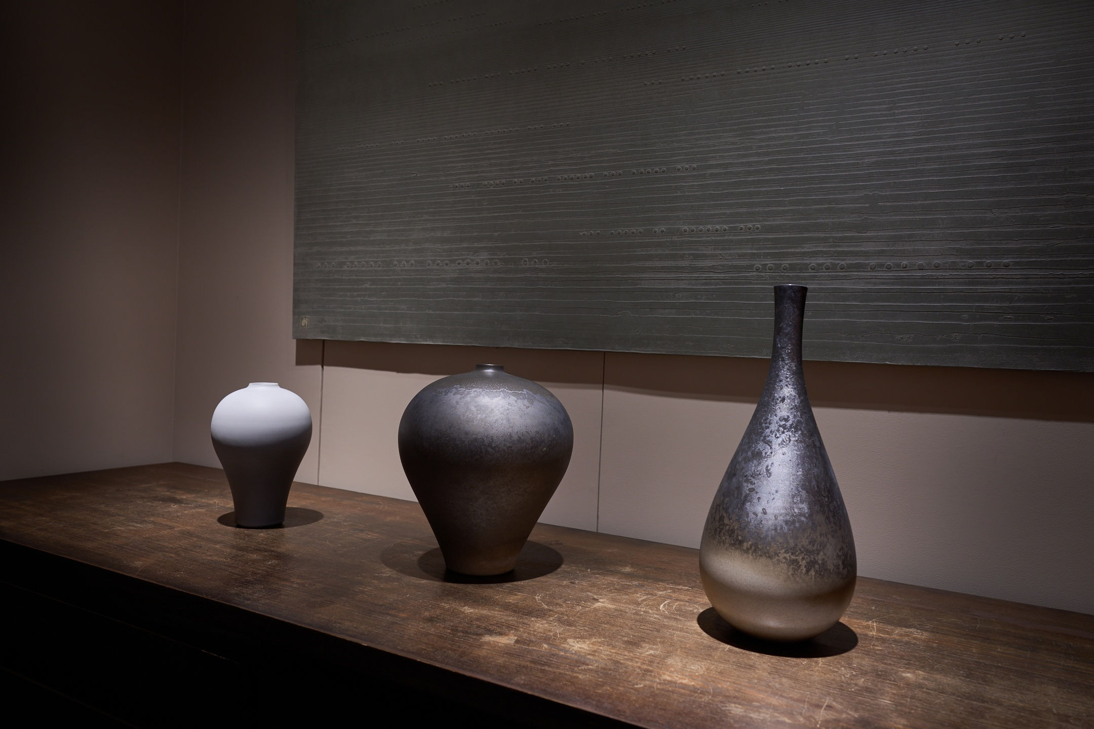 The precise and harmonious contours of Morioka’s pieces are the product of careful handiwork with her three favorite tools: the potter’s wheel, a bucket of water, and her hands. Once she is content with her forms, she places the clay in boxes to protect the surface from the heat and the smoke of burning rice husks, resulting in tender gradients and a milky sheen.