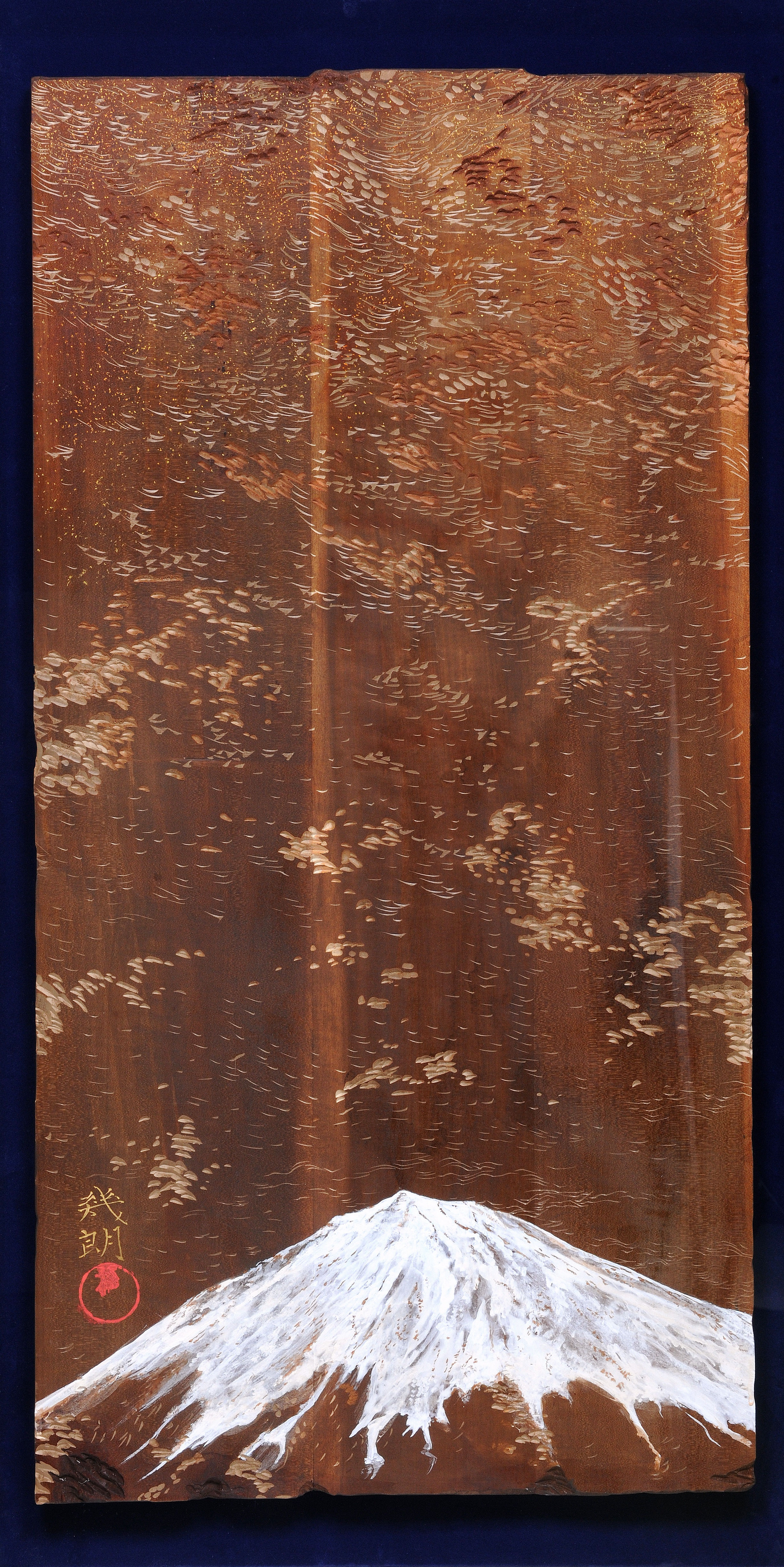 Ikuro Yagi’s paintings do not solely depict nature, nor solely humanity. Rather, they show the relationship between nature and human beings. A majestic beauty waiting dormant, the active volcano is the dreadful truth of Mt. Fuji, and this close proximity is perhaps a familiar reality. “The sort of works that I want to paint now are to get the blood flowing,” Yagi says. He embeds the motif of nature in all new features, painting images that extend to the current societal symbols of manufactured violent dispositions and war. The dynamic compositions and liberated brushwork integrate not just classical Nihonga—flowers, birds, air, and the moon— but truly human suffering, joy, desire, and prayer so that the quintessence of humanity emerges.