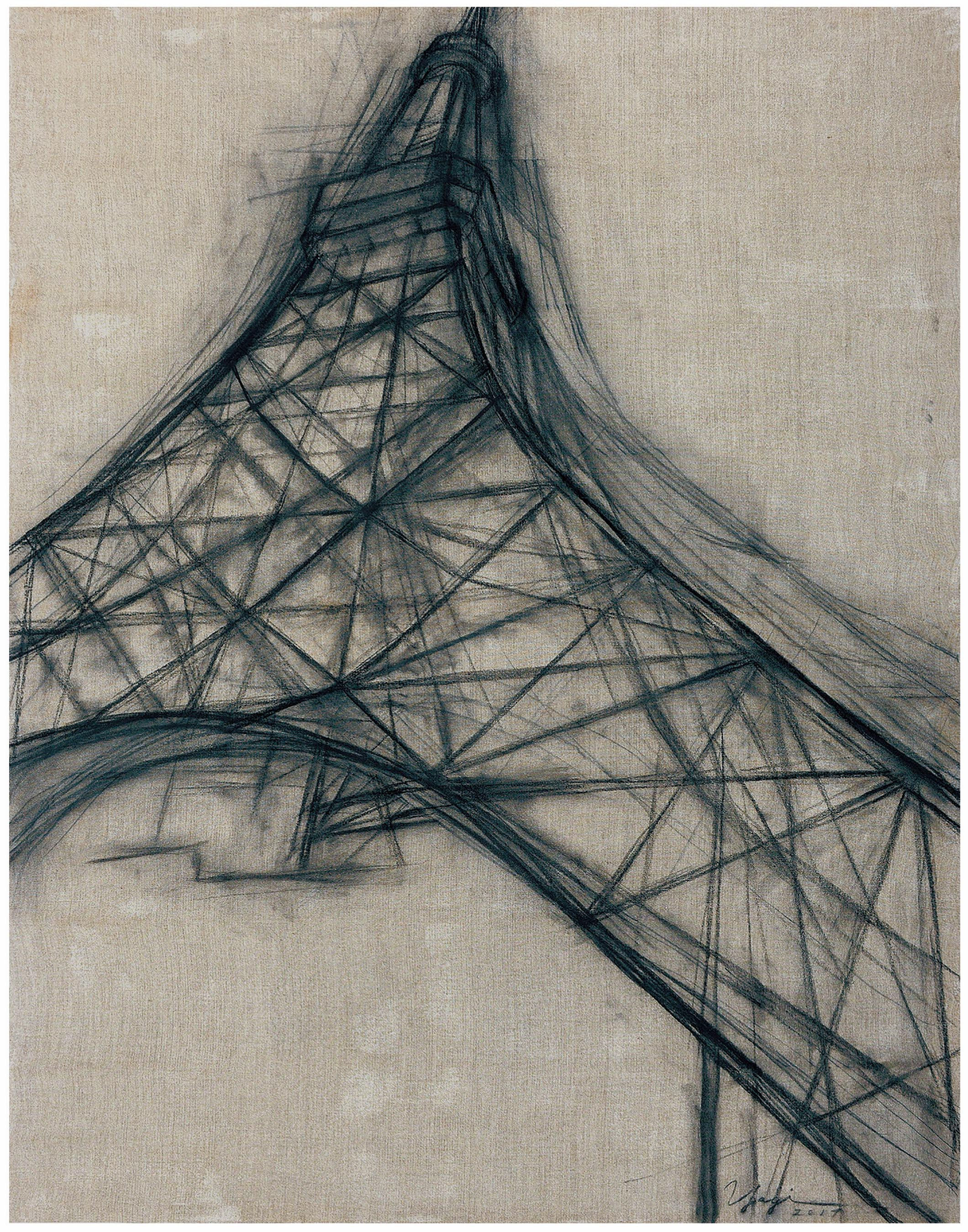 Yagi’s ‘Impression Kyoto’ (2003) meditates on wood as a traditional yet impermeant material; the planks transform from something purely functional into a narrative on the passage of time and reconstruction. The transition of nature in a raw state is the heart of Yagi’s characteristic style; powerful brush strokes and layered paper take on a quality evocative of the works of Picasso, whose collages helped reformulate approaches to image-making and tradition. Yagi’s techniques, bearing semblances of Kanō and Hasegawa influences such as Tōhaku’s Pine Tress Screens, uniquely draw together impressionist and abstract modes of depiction while emphasizing the organic appearance and texture of mineral pigments and sumi, washi paper, and wood.