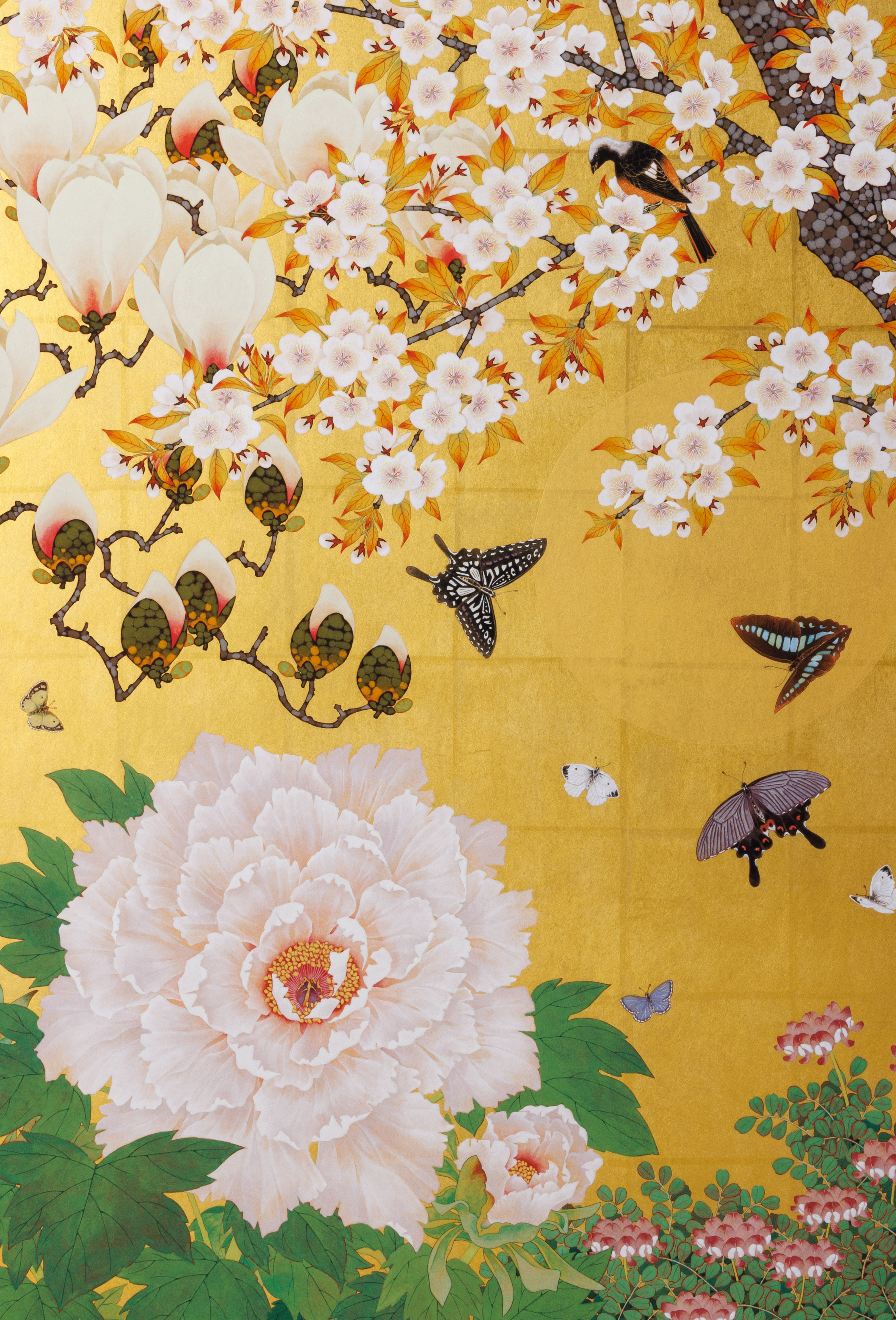 Nakano stands out as a luminary force among those few remaining Nihonga traditionalists today, evoking classical ideas and pushing them to their limits of color, composition, and craftsmanship. His scenes are overflowing with flourishes of complementary colors and dynamic interplay of lively bodies of birds, insects and flowers. Though filled to the point of bursting, Nakano’s canvases strike a balance even as forms and colors overlap with spirited energy. Each line—the primary pictorial tool of Nihonga painters—captures personality and movement with animated grace.